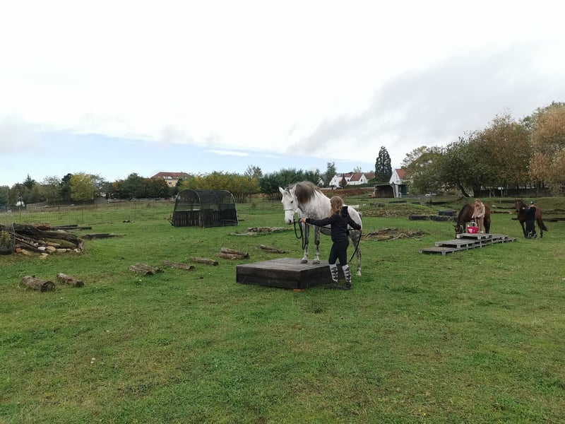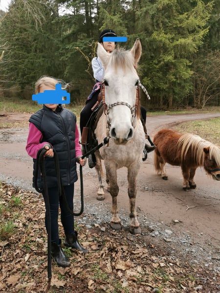Stute 9 Jahre Stockmaß ca 1,40 m Geritten und gefahren Sie ist geritten, hauptsächlich allein im Gelände. Kennt aber auch Platz und Halle, sowie Gelassenheitstraining, Bodenarbeit oder extrem Trail und das macht sie auch alles wirklich großartig. Sie ist sehr unerschrocken. Im Gelände fragt sie schon mal ob sie den Weg bestimmen darf, deswegen würde ich sie nicht als reines Anfängerpferd sehen. Wer aber Unterstützung dabei hat oder einfach konsequent ist, wird das gut schaffen. Sie ist bei uns noch nie durchgegangen. Sollte sie wirklich mal unsicher sein, bleibt sie stehen. Ich finde sie besonders toll, wenn sie von Kindern oder Jugendlichen geritten wird. Dafür eignet sie sich hervorragend. Auch erwachsene Reiter/innen bis 1,70 m und 70 kg sind kein Problem, das schafft sie gut. In der Herde ist sie eher rangniedrig. Sie ist brav beim Tierarzt, Hufschmied und Hänger fahren. Sie kennt Hunde (die dürfen sogar unter ihrem Bauch durchlaufen), Katzen, Hühner, Kühe, Ziegen, tobende Kinder, Traktoren, Motorsäge, Feuer uvm. und zeigt sich dabei recht gelassen. Gefahren ist sie auch, allerdings nicht bei uns. Da ich sie aber beim Kennenlernen damals selbst gefahren bin, kann ich das mit Sicherheit sagen. Hier wurde sie ausgebildet von einem professionellen Trainer im Elsass, der viele nationale und internationale Titel hat. Sie hat einen Westernsattel und wird freizeitmäßig geritten (kann auf Wunsch auch gekauft werden). Aktuell geht sie Barhuf und steht im Offenstall. Im Sommer 24/7 auf der Koppel.