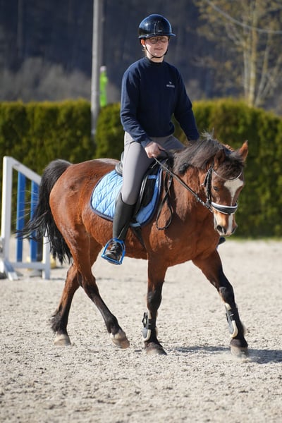 Tolle Stute mit dem passenden Go. Sehr leichtrittig und motiviert, aber immer gut zu Händeln. Egal ob Gelände, Springstunde oder Abteilung, immer brav und willig. Ideales Familienpferd, da auch für Erwachsene geeignet