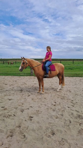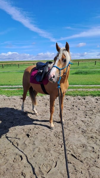 Te koop: driejarige pony merrie, isabelkleurig - rechtstreeks van de fokker. Moeder: pony van 130 cm schofthoogte Vader: hengst Daichi Dalvin, verkocht naar de VS, startend in hunter wedstrijden De merrie is sinds juli in regelmatige training - ze loopt in drie gangen onder een kind, ook in het terrein. Ze werkt met een touwhalster, leert het bit, en loopt onder een Engelse en westernzadel. Ze is vriendelijk, rustig, nieuwsgierig en energiek - ideaal voor kinderen. Regelmatig gevaccineerd, ontwormd en ontdaan van zand, gezond en goed verzorgd. Geweldig voor recreatie en kleine sport.