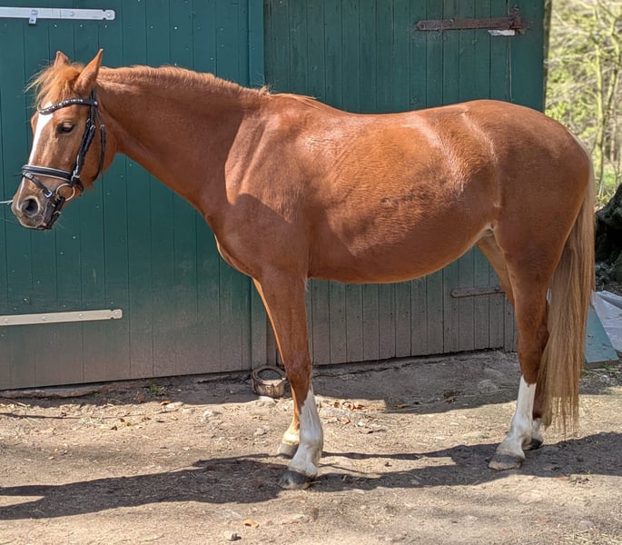 Zum Verkauf steht unsere 4-jährige Reitponymix Stute Draig VS (Kürbis) mit vielseitigem Entwicklungspotenzial für Freizeit und Sport. Draig ist im täglichen Umgang stets freundlich, mitunter etwas keck und aufmerksam. Sie kennt sowohl Laufboxen- als auch Boxenhaltung mit Paddock. In der Herde zeigt sie sich rangniedrig und insgesamt unkompliziert im Sozialverhalten. Als Jährling hat sie sich einen optischen Mangel am Huf hinten rechts (letztes Bild) zugezogen. Dieser beeinträchtigt sie weder im Gangbild noch in der Hufqualität. Bei ernstaftem Interesse können Röntgenbilder vorgelegt werden. Sie ist in allen drei Grundgangarten unter dem Reiter angeritten und präsentiert sich hierbei rittig. Aktuell misst sie ca. 1,43 m, wurde jedoch im vergangenen Jahr offiziell mit 1,40 m als Turnierpony eingemessen, sodass keine erneute Nachmessung für die Eintragung erforderlich ist. Aufgrund ihres Alters und ihres Charakters eignet sie sich akutell vor allem für pferdeerfahrene Personen, die Freude daran haben, ein junges Pony weiter auszubilden. Für Kinder oder Anfänger ist sie noch nicht geeignet, da sie ihre Grenzen durchaus hinterfragt. Desweiteren ist sie regelmäßig gegen Influenza, Tetanus sowie West-Nil -Virus geimpft und entwurmt. Bei ernsthaftem Interesse freuen wir uns über eine Nachricht.