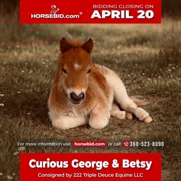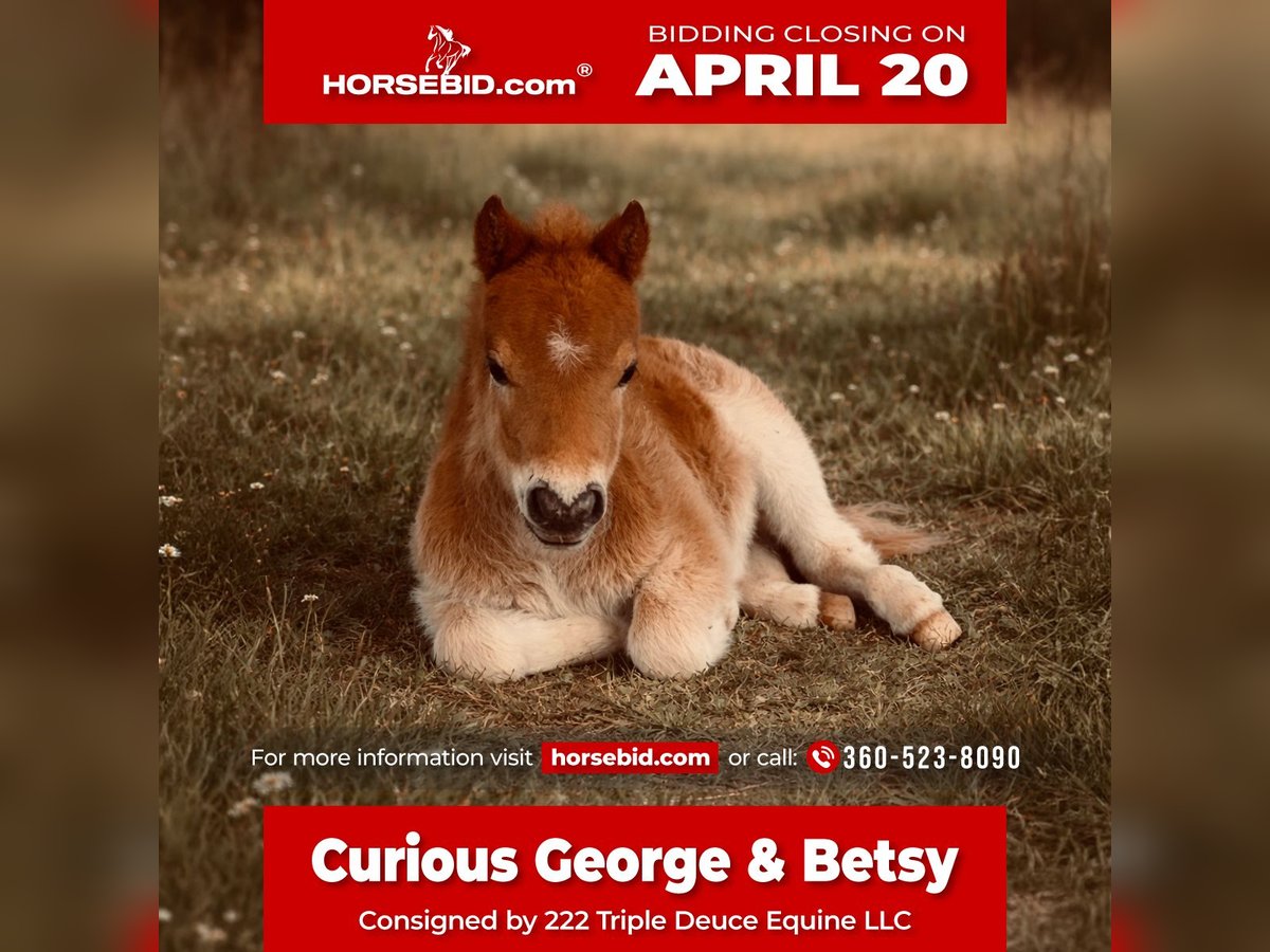 ⚜️𝐭𝐡𝐞 𝓔𝓵𝓲𝓽𝓮 𝐒𝐩𝐫𝐢𝐧𝐠 𝐂𝐥𝐚𝐬𝐬𝐢𝐜⚜️ Happening now thru MONDAY | APRIL 20th - Available EXCLUSIVELY on HorseBid's website! For more details and to register visit: www.Horsebid.com CONSIGNOR CONTACT: 222 Triple Deuce Equine LLC 360-523-8090 LOCATION: Cisco, TX BREED: Mini Ponies REGISTERED: No REGISTERED NAME: Curious George & Betsy COLOR: Paint & Sorrel HEIGHT: 32 inches AGE: 5 GENDER: Mare Curious George & Betsy The cutest bundle you’ll ever get your hands on! This pair sells together. “Betsy” – Paint mare, 5 years old “Curious George” – Sorrel colt, 1 month old Sweet as can be and gentle! This little guy is so small he could practically be picked up and put in your pocket. He would make a great therapy pony, companion, or future riding pony as he grows up. Built right and full of personality, you’ll be laughing daily with Curious George around. Betsy, the mare, is halter broke, a great mom, and ready to be started under saddle or continue producing babies. Cisco, TX Shipping available 360-523-8090