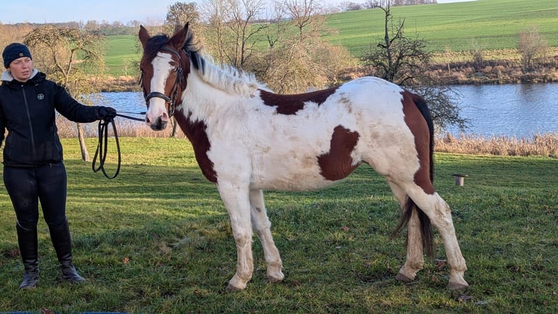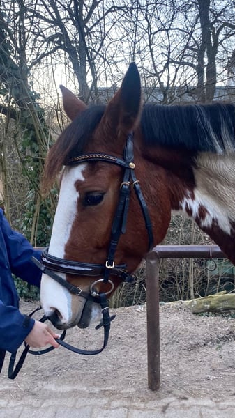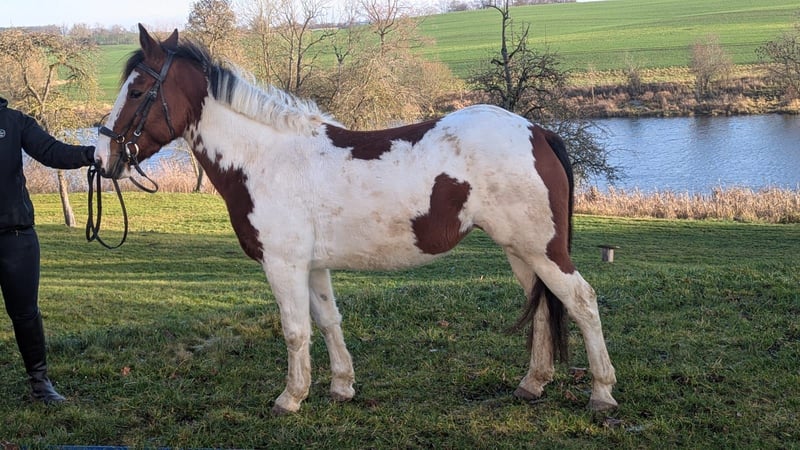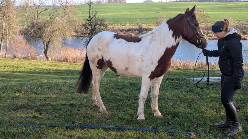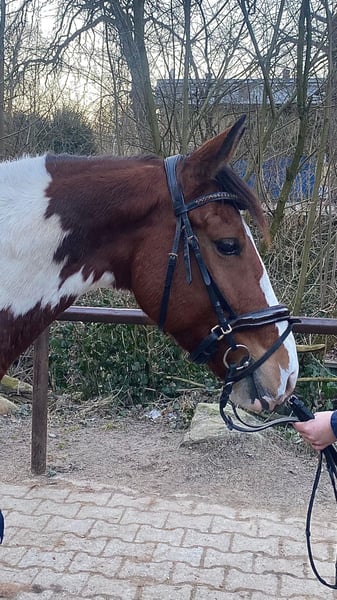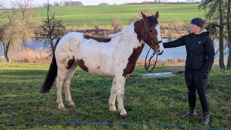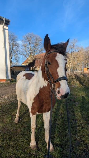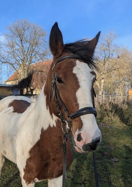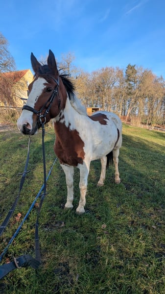 Beautiful pinto mare looking for her new home. Melody is well-behaved in handling, with a clear mind and a desire to please. She has a heart in the right place. She seeks contact with people and enjoys cuddling. She has been ridden by children and is familiar with handling around kids. She loves being groomed, remains calm when tacked up and mounted. She is sensitive and easy to ride in all three basic gaits. She has been ridden in groups on trail rides, jumps small obstacles, and is familiar with riding in the arena and indoor riding hall. She is healthy, free of respiratory issues, free of eczema, and barefoot. She gets along well with other mares and geldings. Currently, she is stabled at night. She is accustomed to dogs and agricultural machinery. Given her age, we can easily imagine Melody as a mother-daughter pony or suitable for older children with some riding experience.