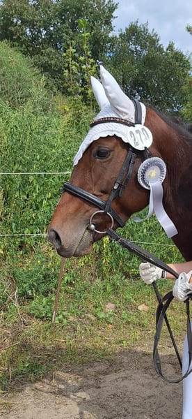 Amira is a very strong-willed pony mare, which makes her completely unsuitable for my riding school. She needs a confident handler who is not easily intimidated by her dominant nature. When given the right person, she becomes a friendly and outgoing partner with whom you can go through thick and thin! Her enthusiasm for jumping is particularly noteworthy. She demonstrates a lot of talent and courage in this discipline. Even on unfamiliar riding surfaces and at competitions, she performs excellently, despite her still limited experience. My 10-year-old daughter has already ridden her in small timed and style jumps, and she behaved very well both in the warm-up area and during the tests. Loading her onto a trailer or large truck and waiting "hanging" in the trailer are also no problem at all for her. Recently, she was the fastest pony in a jump and run competition with an advanced rider. In dressage, her incomplete basic training is still noticeable. She lacks correct connection and suppleness. With a skilled rider, she already performs quite well, and it is increasingly clear how trainable she is. With an experienced rider, she could now master elementary E-level dressage. Even advanced beginner children can now ride her in a lesson, but she still requires a lot of work and development. In the terrain, she behaves calmly and motivatedly in a group (front, back, or middle – it doesn't matter) and enjoys jumping small logs and similar obstacles. She has not yet been ridden out alone, as this is not practical with my children and students, and I am too large and heavy myself. Amira is happy to be backed and started under saddle at my place. Due to her strong ambition and energy, I can also very well imagine her in trail riding or cone courses. Our stable team includes highly successful trainers from around the world, and we can also provide high-quality, suitable tack for her. Health-wise, Amira has never had any issues. She is vaccinated according to LPO standards, and her teeth are in excellent condition. She was shod in front by her previous owners due to very hard ground on the riding surface. I have been barefoot for two years, and she shows no problems whatsoever. She is kept in an open stable with other mares and gets along well with both 24/7 hay and portioned feed. She can also be turned out at night without any issues. In the herd, she is dominant but never aggressive or bossy. Of course, there was some initial clarification among the mares, but I never observed her being excessively rough. You are welcome to meet and try her out. Please note that Amira is NOT a children's pony and should not be handed over to an inexperienced or shy child.