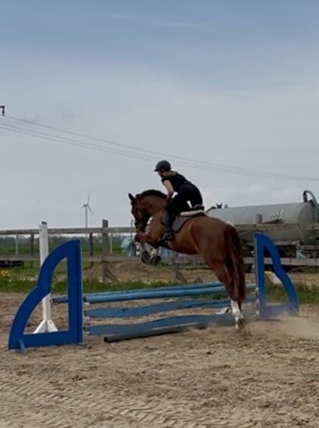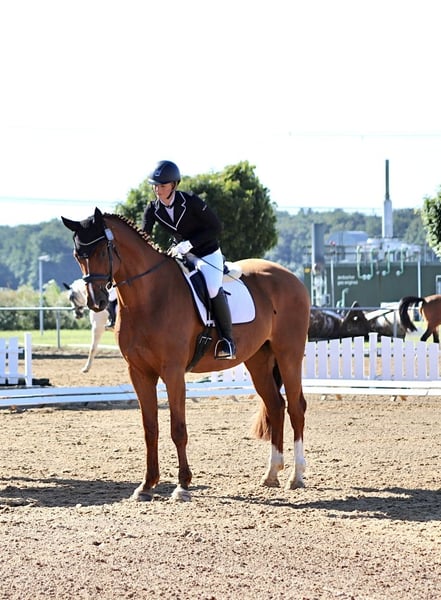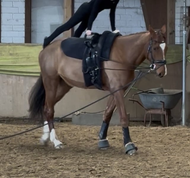 Aus Zeitmangel aufgrund meines Studiums steht mein 7 jähriger Wallach „Benno“ zum Verkauf. Er ist ca. 1,75m und deckt somit auch größere Reiter/innen sehr gut ab. Er befindet sich auf einem soliden A-Niveau in der Dressurarbeit. Im Parcours zeigt er sich auch stets motiviert und das regelmäßige Freispringen bereitet ihm viel Freude. Er zeigt dort Übersicht und ist stets ehrlich am Sprung. Auch, wenn der Fokus in unserer täglichen Arbeit nicht auf dem Springen liegt, wird Benno trotzdem regelmäßig mit Stangen gearbeitet. Er geht brav in der Gruppe ins Gelände und ist natürlich absolut Schmiede- und verladefromm. Ein wenig Turnierluft konnte er bereits schnuppern und verhielt sich dort jungpferdgerecht. Auch an einigen Lehrgängen auswärts hat er bereits teilgenommen. Benno ist ein richtiger Kumpeltyp und liebt es lange verwöhnt und umsorgt zu werden. Dem Menschen gegenüber ist er nie böse. Ich würde ihn als artiges Pferd bezeichnen, der mit seinem jungen Alter ab und zu nochmal etwas grün hinter den Ohren ist, aber stets händelbar bleibt und viel Quatsch mitmacht. Volti würde bisher einmal angetestet (siehe Fotos) dort zeigte er sich sehr brav und aufgeschlossen. Die Zähne wurden im Februar 2026 nochmal gemacht. Eine AKU aus 10/2023 liegt vor, eine aktuelle kann auf Wunsch und gegen Kostenübernahme gemacht werden. Wir freuen uns auf eure Nachrichten und beantworten gerne offene Fragen