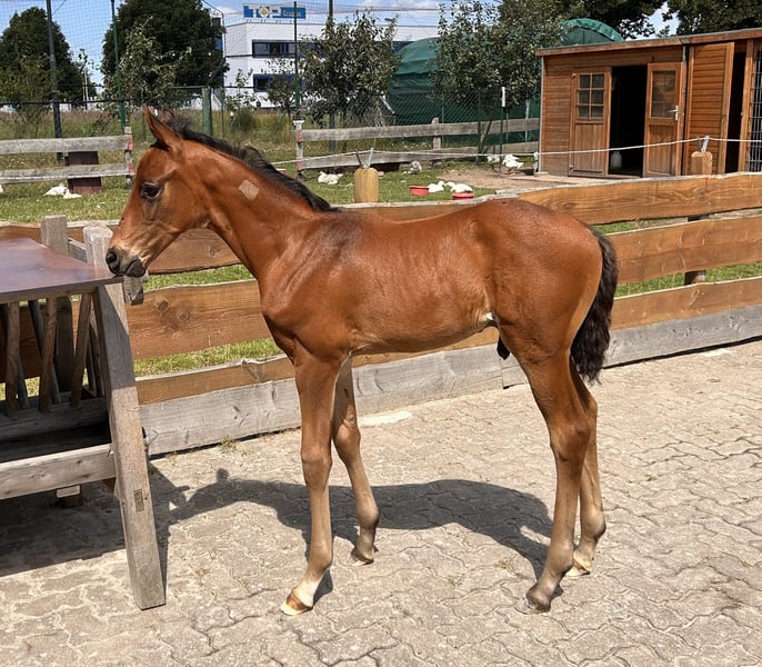 Go for Gold è un puledro stallone molto moderno e corretto, dotato di buoni movimenti, da Go for Romance (Governor - Fürst Romancier - Sir Donnerhall I) da una madre (Sandro Hit - Donnerhall - Rohdiamant). Conosce l'ABC del puledro, è stato sverminato regolarmente e a partire da dicembre 2024 il giovane potrà trasferirsi nella sua nuova casa. Go for Romance PS è attualmente vincente e piazzato fino al livello L per cavalli da dressage, sua nonna Gesina è la madre di For Romance I & II. La madre Saphira M è la sorella piena di San Francisco OLD, che compete con successo fino a Inter I. Ha già un discendente dalla combinazione con Secret che è arrivato alla classe pesante. La nonna Rosenfee è la madre di Sancisco OLD, che gareggia fino al Grand Prix con Carrie Schopf. Un puledro stallone di grande interesse per l'allevamento e lo sport. Per ulteriori informazioni o per fissare un appuntamento per conoscerlo, siamo a vostra disposizione.