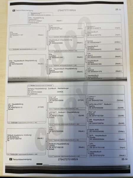 For sale: Mecklenburg Warmblood, stallion, foal, born on May 17, 2024, see picture 1 in the foreground. Assessment: Type: 8; Conformation: 8; Movement: 8; Total: 24 points = Foal Premium Sire: Elite Stallion Grabenstern I; Old Mecklenburg line, see picture 5 Dam-Sire: Ecki D, East Frisian Oldenburg, see picture 6 Additional pedigree: "Old Mecklenburg Line" The foal will be weaned from the mare at the end of September. Negotiations only in person.