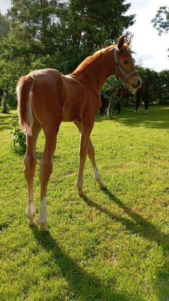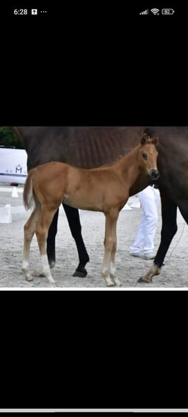 Lovely filly by Pjethro (Kjento - Desperado) Born in June, she has three excellent basic gaits. Her dam is a state premium mare by Sandro Hit/Lanthan, who has produced very good foals that were sold to Blue Horse and Schokemöhle. A daughter of Joviam was sold at a high price to the USA. She has a charming personality and is always affectionate. She is familiar with basic foal handling and has been regularly dewormed. At the foal inspection, she received the elite premium. Later on, she could develop into a fantastic dressage horse. For breeding purposes, she can also remain at her current location a bit longer.