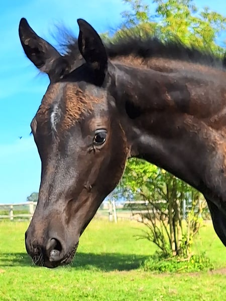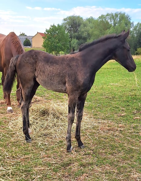 For sale is a dressage-bred filly. Pedigree: Sire: DSP Dream Royal Dam: State Premium Mare Fürst Romancier x D'Olympic x Rubinstern - Date of birth: May 23, 2025 - Will be black - Estimated final height: 1.70 m The pedigree unites the guarantors of dressage sport. "Overall, this is a horse where one can envision a great career both in breeding and especially in sport!" Our filly stands in a modern and athletic type, presenting with an extraordinary presence, excellent top line, a very good neck, and a noble head. Donnabell shows light, airy movements and an active hindquarters. At the championship, her correct foundation, presence (type), as well as her interior, exterior, and movement were rated highly by the judging panel. Her sire is stationed at Gestüt Sprehe. He is the champion stallion of the DSP licensing in Munich. The dam has achieved the state premium and has presented several outstanding winning foals in recent years, including one licensed stallion. Video can be sent upon request. Initial contact preferred via WhatsApp or by phone. 01724020355
