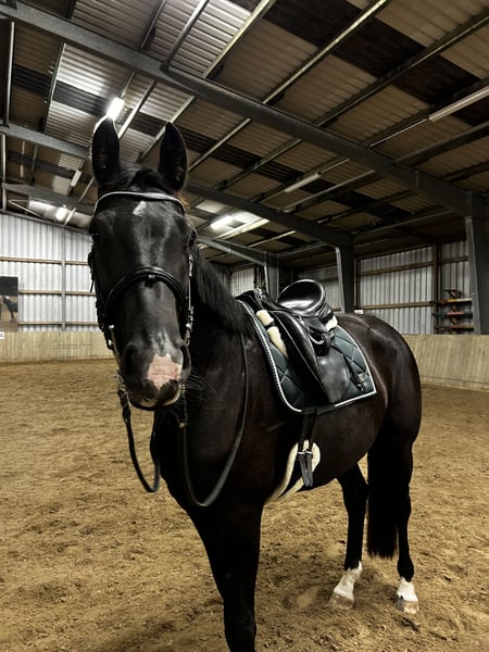 Ich bin Baila, eine 5 Jahre alte Mecklenburgische Warmblut Stute. Ich bin ca. 1,70m groß. Ich wurde im Juli eingeritten und brauche jemanden der Geduld hat und mir zeigt was ich wie machen soll. Ich hatte aufgrund einiger Umstände zwischenzeitlich Pausen vom reiten wodurch ich noch sehr am Anfang stehe. Ab und an kann ich sehr stur und Dominant sein. Wenn du zu viel von mir verlangst, zeige ich es sehr deutlich, da es für mich zu viel wird. Ich kann aber sehr gut arbeiten und bin immer bemüht es dir recht zu machen und mit zu arbeiten. Ich habe von Geburt an einen Karpfenrücken, welcher mich aber gar nicht mehr einschränkt. Meine Besitzerin löst meine Muskulatur aber auch regelmäßig durch kleine Übungen. Sobald ich Vertrauen zu dir gefasst habe, bin ich sehr zugänglich und bereit alles mit dir zu erleben. Wenn du eine Aufgabe suchst und mit einem Pferd gerne und viel arbeitest, melde dich doch gerne, damit ich dich kennenlernen kann. Hufschmied kennt sie gut Aktuelle Bilder/Videos können auf Anfrage gesendet werden.