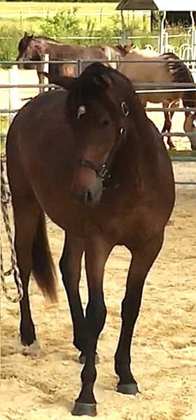 Ce sympathique poulain lusitano-arabe (Cruzado) bai possède de longs crins noirs et fournis. Sa morphologie est longiligne mais équilibrée et harmonieuse. Sa belle tête au front large et au profil rectiligne est portée par une encolure longue et déliée. Ce jeune hongre possède des allures relevées avec une belle amplitude et une propulsion transmises par son père. Élégant en mouvement il allie la rondeur, la souplesse et l’équilibre. D’une personnalité attachante, Mikado se montre peu impressionnable, très équilibré et zen. Curieux et malin, il apprécie la compagnie de l’Homme et cherche à faire plaisir. Cheval de sport polyvalent en devenir il toisera, adulte entre 1,55 et 1,60 m. Le rebond comme l’engagement de ses allures représentent des avantages pour le dressage mais également le saut (CSO-CSE), le plat ou l’endurance. Débourré depuis mars 2025, il est travaillé également en liberté, à pied et en longues rênes. Son prix évolue avec l'avancement du travail. Comme tous nos chevaux, Mikado est vacciné, vermifugé, complémenté et suivi en dentisterie comme en ostéopathie régulièrement. Tous nos poulains sont manipulés, élevés en groupe et surtout sevrés tardivement vers 10 ou 11 mois pour leur équilibre. Plusieurs autres chevaux sont disponibles à la vente à l’élevage, et visibles sur le site du Haras du Grémillon. Ne pas hésiter à prendre contact par SMS pour plus de renseignements.