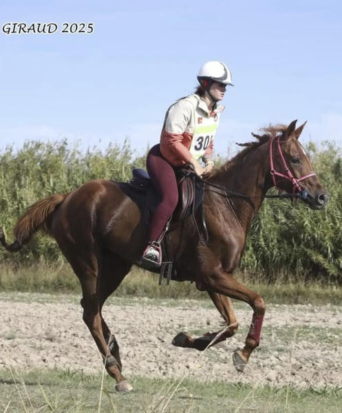 Jument DSA 9 ans Alzan 1m60 .Qualifiée 2 fois aux 100km (Amateur grand prix) Elle est gentille ,calme, avec beaucoup de sang froid, bonne récupération cardiaque, prete pour 2 étoiles, convient à toutes disciplines. Dernière course 28 septembre 2025,A Salin de Giraud . Gagnant Amateur1 Grand prix (100km ) Vitesse 18km à l heure à chaque boucle récupération immédiate, avec un trés bon comportement et un moral d'acier . C'est une jument avec beaucoup de qualités physiques ,qui peut convenir à toutes les disciplines.