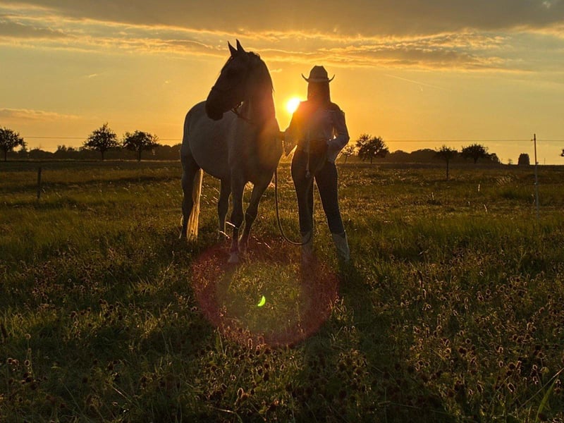 Gesundheit: Casanova ist Tetanusgeimpft, die Zähne sind gemacht, er ist entwurmt, ist exzemfrei und hat keinerlei schimmeltypische Melanome. Er ist menschenbezogen, charakterstark, arbeitswillig und will täglich gefordert werden. Er kennt Hof und Dorf, Hunde, Katzen, Wild, Traktoren, Landmaschinen, Fahrzeuge etc. Neuem gegenüber ist er aufgeschlossen und neugierig. Er ist schmiedefromm, läuft derzeit barhuf, war aber auch schon voll beschlagen. In der Halle ist er eher träge, im Gelände hat er dafür gut Go. Er geht problemlos alleine ohne Anstalten von der Herde weg und „klebt“ nicht. Er wurde von mir zunächst nur ohne Sattel geritten. Beim späteren Reiten mit Sattel hat sich herausgestellt, dass er wohl einen Sattelzwang hat. Dieser äußert sich beim Putzen und Satteln durch knabbern am Strick und durch zuschnappen. Ich hänge ihm inzwischen zur Beschäftigung und Ablenkung dabei ein Spielzeug auf. Wenn der Sattel erstmal drauf ist, gibt es keinerlei Probleme und auch Nachgurten ist kein Thema. Casanova kennt die Boxenhaltung, stand aber auch schon im 24/7 Offenstall zusammen mit 3 Stuten. Er verträgt problemlos Heu und frisches Grün. Er ist ausdrücklich nicht für Kinder oder Anfänger geeignet, da er ein charakterstarkes Pferd ist, das neuen Personen gegenüber zu Beginn skeptisch sein kann. Hier testet er auch aus und nimmt dabei auch die Ohren nach hinten. Wenn er merkt, dass er damit nicht durchkommt, dann hört er aber wieder auf. Daher benötigt er eine erfahrene Person, die ihm mit liebevoller Strenge, Zeit und Vertrauen die nötige Sicherheit gibt und ihn mehrfach die Woche, am besten täglich arbeitet. Da ich diese Zeit leider nicht habe, hatte ich ihn mehrere Monate im Vollberitt, um ihm halbwegs gerecht zu werden, was aber auf Dauer nicht die Lösung ist. Momentan verbringt er auch wetterbedingt viel Zeit in der Box und möchte sich entsprechend austoben, wenn er dann rauskommt. Daher ist ein Probereiten aktuell nur bedingt möglich. Falls du die Herausforderung annehmen und Casanova kennenlernen und ihm ein neues Zuhause geben möchtest, schreib mir gerne.