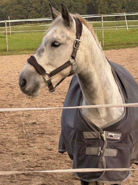 Kala is a stunning Polish Warmblood mare. Her appearance suggests that there may be Arabian bloodlines in her pedigree. She is well-schooled under saddle, familiar with groundwork exercises such as lunging and pole work, and is used to being in a herd on the paddock and pasture. She is also accustomed to stable life and is loading-friendly and barefoot. Although her health records show no signs of allergies, she wears an eczema blanket during the summer months. Kala is enchanting and affectionate, but not suitable for beginners. She needs a confident handler whom she can trust and who can provide her with stability and reassurance.