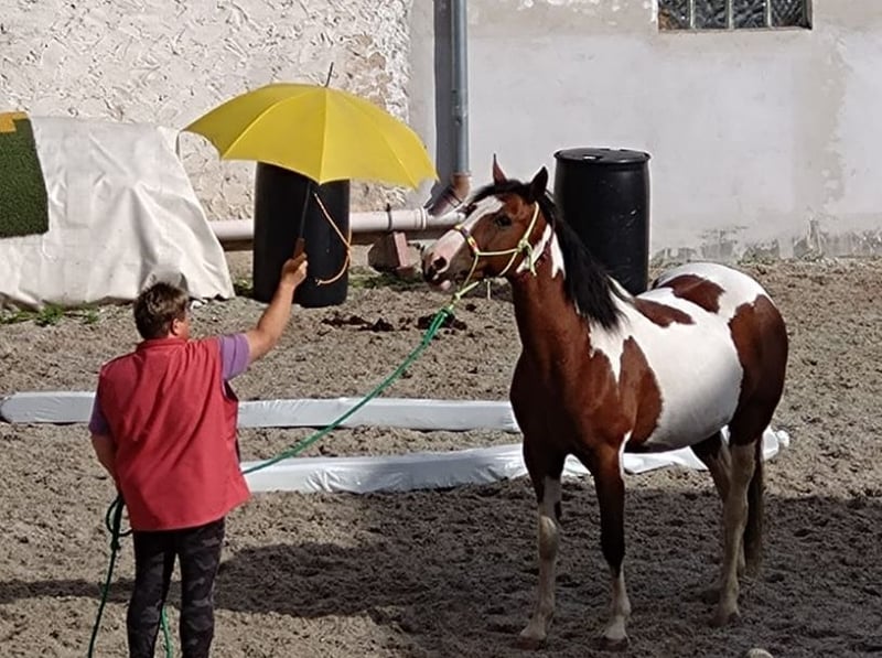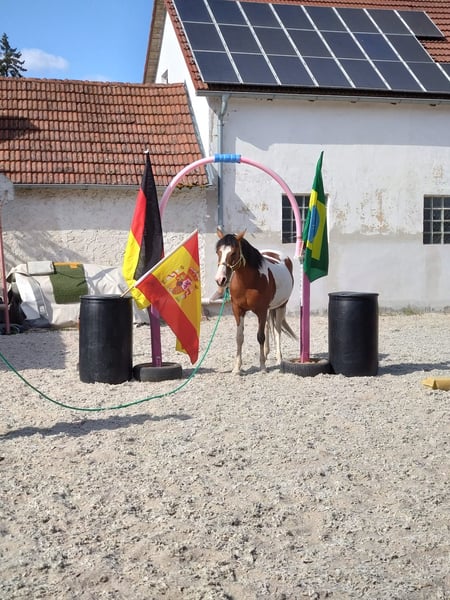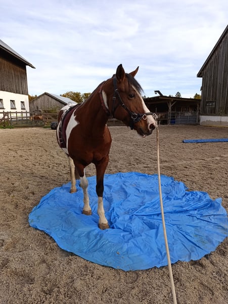 Bestandsverkleinerung!!! Rohdiamant: Wir verkaufen aus reinem Zeitmangel unsere superliebe und bildhübsche Scheckstute. Sie wird heuer 7 Jahre alt, ca 1,48 m groß, Tobiano mit polnischem Pass. Die Stute ist sehr sensibel und braucht ne Weile bis sie "ihrem" Menschen vertraut. Sie lernt sehr schnell und möchte am liebsten jeden Tag was mit ihrem Menschen machen, liebt Bodenarbeit,Freispringen, Spazierengehen und tüddeln. Sie kennt Knotenhalfter,Kappzaum, Trense,Longiergurt, Sattel, Doppellonge (begonnen), Plane. Flattertor etc. Hänger fahren. Noch kein Reiter drauf gewesen, nur sandgefüllte Hose als Gewicht! Jetzt längere Pause Wetter bedingt, wird gerade wieder antrainiert. Sie hat ein ein gutes Fundament, Traumhufe (barfuß) und ist kerngesund ( wäre auch für die Zucht interessant) Uns fehlt leider doch die nötige Zeit um sie fertig auszubilden, deshalb sucht sie aber nur wenn alles passt, einen Besitzer der mit ihr durch dick und dünn geht. Kein Notverkauf!!!! Bei Interesse bitte Nachricht mit ein paar Infos zu euch und Telefonnummer dann rufe ich gerne zurück.