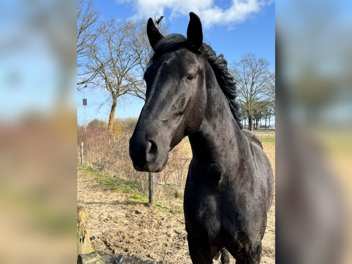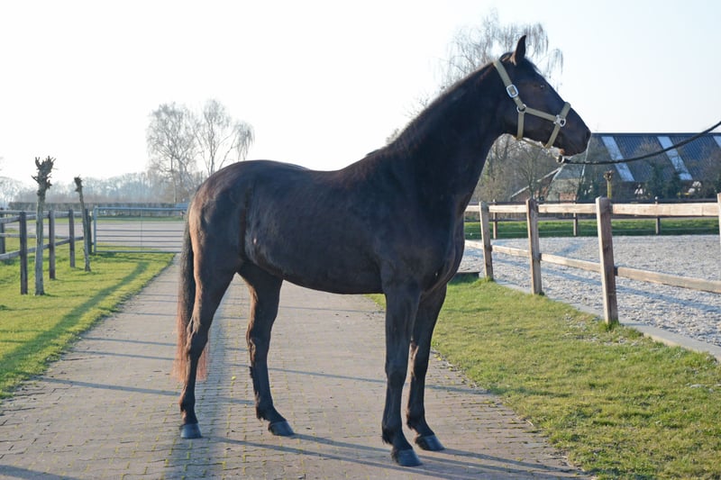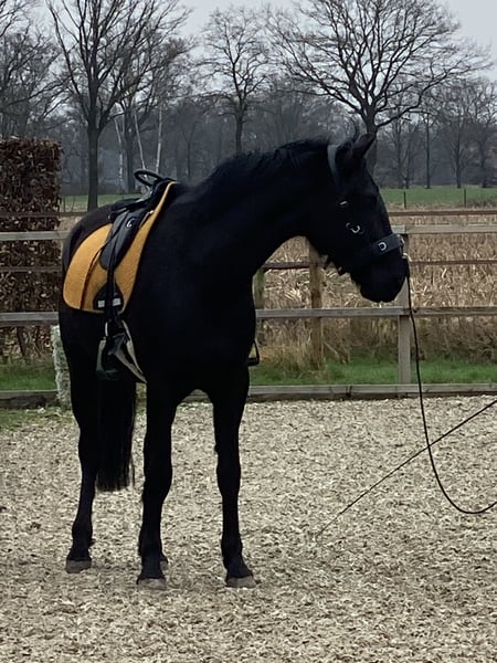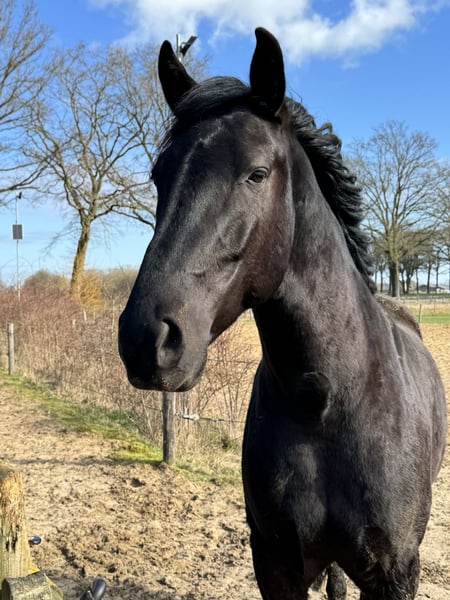 🌟 Deze super knappe ruin is klaar voor zijn volgende stap Deze bijzondere ruin is toe aan een nieuwe fase in zijn carrière. Wij hebben hem gekocht toen hij één jaar oud was. Daarna is hij nog een jaar op Menorca gebleven, waar hij in een natuurlijke omgeving kon opgroeien. De ondergrond daar speelt een belangrijke rol in het ontwikkelen van sterke hoeven en pezen – een waardevolle basis voor de toekomst. Vervolgens heeft hij twee jaar in Nederland gestaan bij zijn maatje uit Menorca, samen met nog een Spaanse ruin. In die periode heeft hij al veel positieve ervaringen opgedaan: hij is mee geweest naar het bos, heeft gewandeld langs de grote weg, is gelongeerd, heeft de eerste beginselen van de Spaanse pas geleerd en heeft al zadel opgehad. Hierdoor zal hij het zadelmak maken naar verwachting vlot en ontspannen doorlopen. Ook in de vrachtwagen is hij braaf: hij loopt er rustig op en staat netjes tijdens transport. In mei 2024 is hij bij ons thuis gekomen, waar hij de tijd heeft gekregen om verder uit te groeien – het zijn tenslotte laatbloeiers. Hij loopt in een groep van negen paarden (KWPN) en heeft daar vanaf dag één moeiteloos zijn plek gevonden. Hij trekt veel op met de leidende merrie, speelt graag met de andere ruinen en is opvallend lief en voorzichtig naar de veulens. Hij kan 24/7 buiten staan, maar is ook gewend om ’s nachts op stal te staan. Hij is sociaal, stabiel en voelt zich prettig in een groep. 💛 Wat wij voor hem zoeken Wij gunnen hem een fijne, betrokken plek waar hij echt een maatje voor iemand mag zijn. Een plek met goed management en een rustige, positieve manier van trainen. Hij zou perfect passen bij iemand die houdt van afwisseling: * grondwerk * buitenritten * Working Equitation * dressuur Het allerbelangrijkste voor ons is dat hij op een 5⭐️-plek terechtkomt, waar hij met aandacht en plezier verder mag groeien. Wil je meer weten over deze bijzondere paarden? De Menorquín De Menorquín is een paardenras afkomstig van het Baleareneiland Menorca in Spanje. Beschrijving Het is een fier barokpaard met een diepzwarte vacht en een rijke, weelderige manen- en staartgroei. Veulens worden bruin geboren en verkleuren later naar zwart. Aftekeningen zijn binnen het ras niet gewenst. Het ras staat bekend om zijn elegante uitstraling, rustige temperament en gehoorzame karakter. De paarden beschikken over soepele, ritmische gangen en combineren sierlijkheid met kracht. Daarnaast zijn ze sober, robuust en kunnen zij een hoge leeftijd bereiken – soms tot wel veertig jaar. Gebruik De Menorquín blinkt uit in de hogeschooldressuur. Tijdens traditionele religieuze processies op Menorca tonen zij hun indrukwekkende kunsten in de straten, waar zij door het publiek bewonderd worden. Bij de zogeheten Jaleo-feesten staan en lopen de paarden vaak langdurig op de achterbenen. Door hun natuurlijke aanleg voor deze spectaculaire bewegingen, waaronder de courbette, vragen zij om een ervaren en evenwichtige ruiter. Op Menorca is zelfs een eigen vorm van klassieke rijkunst ontwikkeld: de Doma menorquina. Fokkerij Lange tijd werd de Menorquín beschouwd als een subtype van de Andalusiër. Tot de voorouders van deze Iberische paarden behoren onder andere de Berber, de Arabier en de Lusitano. Een verwant ras op Mallorca is de Balearenpony (Caballo mallorquín). In 1989 werd het eigen stamboek opgericht onder de naam Caballo de Pura Raza Menorquina. Het ras telt momenteel ongeveer 2.500 geregistreerde paarden en vertoont een stijgende populatie. Op beperkte schaal worden Menorquíns geëxporteerd, onder andere naar Nederland.
