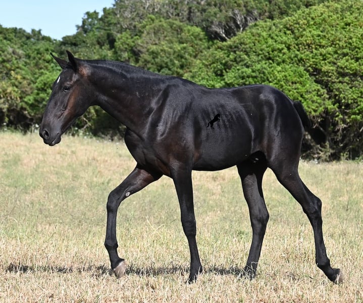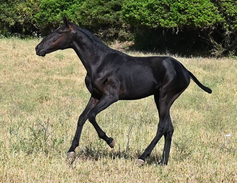 This purebred Menorquin stallion, born in spring 2024, is a truly affectionate and calm treasure! He has no young horse nonsense in his head—on the contrary! He prefers to cuddle, always wants to do everything right, and is incredibly calm for a young horse. If he continues like this, he will definitely become a real family horse! He is allowed to live in a robust environment with company, making him well-socialized and resilient. Not only does he master the basics of foal training with flying colors, but he has also been presented at a breeding show and is familiar with lunging in a halter and being in new places. He comes from old lines of the Menorquin, and his father is over 170 cm tall. His expected final height is around 163 cm, and apart from his sparkling star on his forehead, he is completely black. If you wish to pick him up later, a rearing place can be organized for him. Videos and pedigree are available upon request. His location is Menorca. I would be happy to organize a foal vet check, transport, or your trip if you would like to come see him in person. Details can be found on my page or in conversation. Greetings from Spain!