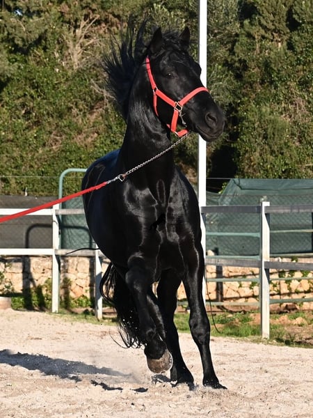 Este semental de Menorquina, nacido en 2021, es sin duda un hermoso representante de esta noble raza. De color negro brillante con una melena con ondas naturales y sin un solo cabello blanco, ¡una verdadera elegancia! Además, posee movimientos muy buenos, lo que lo hace interesante para la doma, especialmente si se desea entrenar en inglés, ya que actualmente está entrenado en la técnica de doma menorquina, que se monta en una mano. Sin embargo, la transición no le resultará difícil, ya que es muy inteligente y, habiendo sido trabajado en carro, conoce el manejo de las riendas. Es un caballo muy fino bajo el jinete, muy trabajador y con una presencia increíble. Como también es muy flexible y ligero de patas, es un candidato interesante para la Working Equitation. Su formación básica es muy sólida, domina los trabajos laterales y el paso español. También realiza el bot, el paso elevado, aunque solo lo hace a petición, ya que respeta claramente las órdenes. Ya mide unos imponentes 1,69 m y probablemente aumentará un poco en su exterior barroco, ya que los menorcinos son de desarrollo tardío y no alcanzan su plena madurez hasta los 8 años. De excelente linaje, proviene de un padre de líneas clásicas muy bueno y de una madre premiada con sangre de élite, que ya ha transmitido y dado a luz una hermosa cría de semental. En mano está bien criado, aunque algo juguetón, ya que actualmente no se trabaja mucho con él por falta de tiempo de su dueño, lo cual también es la razón de su venta. Tras unos minutos de paseo, se muestra muy relajado e incluso puede quedarse quieto junto a la pista de doma durante minutos, mientras conversas. Bajo un manejo adecuado, este caballo tiene mucho potencial, y también es un verdadero tesoro para el ocio, especialmente si recibe más actividad (o en un paddock o establo abierto). También sale a pasear, generalmente en pareja o en grupo. Cuando hay yeguas, bailotea un poco para mostrar lo hermoso que es, pero pronto se da cuenta de que es una pérdida de tiempo y se relaja. Para quienes no puedan mantenerlo como semental, existe la opción de castración en el lugar. Su ubicación actual es Mallorca. Videos y genealogía disponibles bajo petición. Con gusto puedo organizar una evaluación veterinaria, entrenamiento, castración, transporte o incluso su viaje, si desea venir a verlo en persona. Para más detalles, consulte mi página o hable conmigo. Saludos desde España