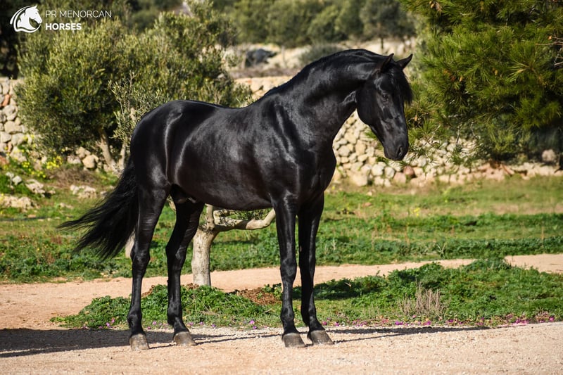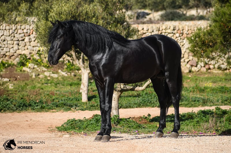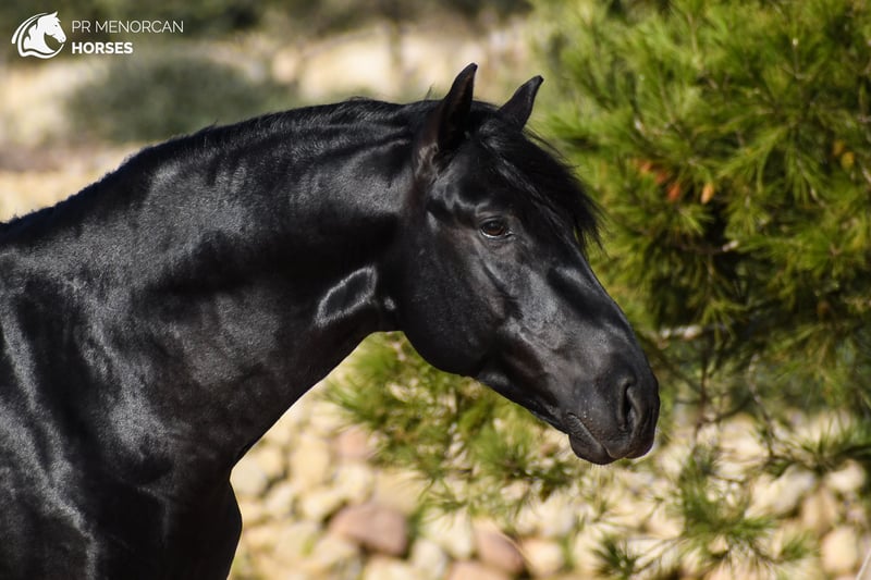 ste precioso semental Pura Raza Menorquina, nacido en 2020, destaca por su elegancia, talento y carácter noble. Con su negro absoluto y una altura de 162 cm, posee una genética excepcional, siendo nieto de un campeón de raza. Domado en doma clásica y menorquina a nivel medio, realiza paso, trote, galope, ejercicios laterales y el tradicional "bot" con soltura. Es un caballo sensible y trabajador, ligero en la mano, con ganas de aprender y siempre dispuesto a dar lo mejor de sí. Tanto en la pista como en el campo es un caballo seguro y confiable, perfecto para distintas disciplinas. En el manejo es noble y respetuoso, bien socializado con otros caballos. Sube sin problemas al remolque, se porta bien con el herrero y se adapta fácilmente a diferentes entornos. Pasó sus primeros tres años en libertad con otro caballo y ahora vive estabulado cerca de sementales y yeguas sin inconvenientes. Aún no ha sido valorado como reproductor, pero podemos gestionarlo si lo deseas. Si la cría no es de tu interés, también podemos organizar su castración antes del transporte. Se encuentra en Menorca, y nos encargamos de todo el proceso para que sea sencillo y seguro, incluyendo examen veterinario, documentación y transporte a cualquier parte del mundo. Para más información y vídeos, contáctanos por privado! Saludos :)