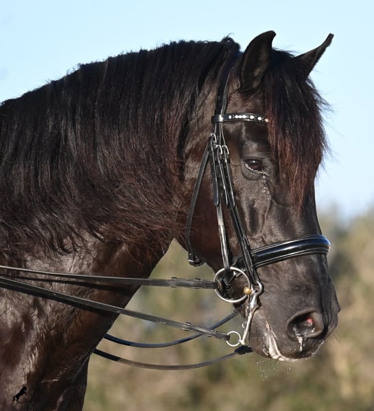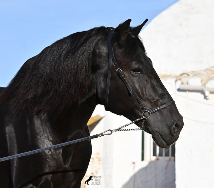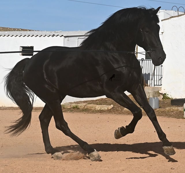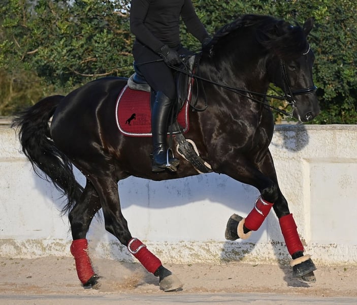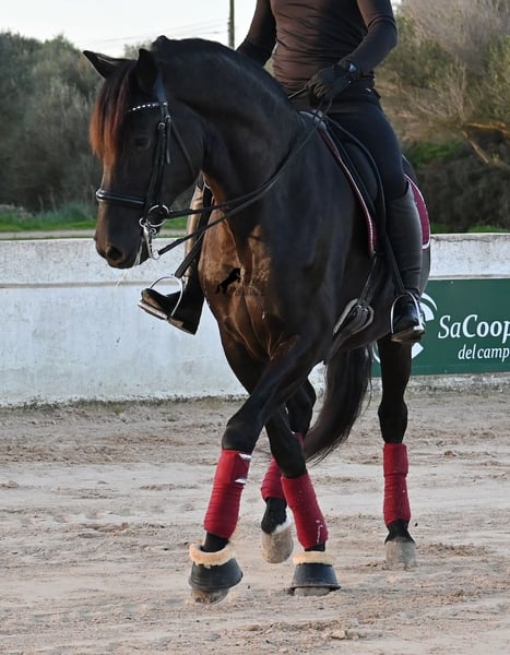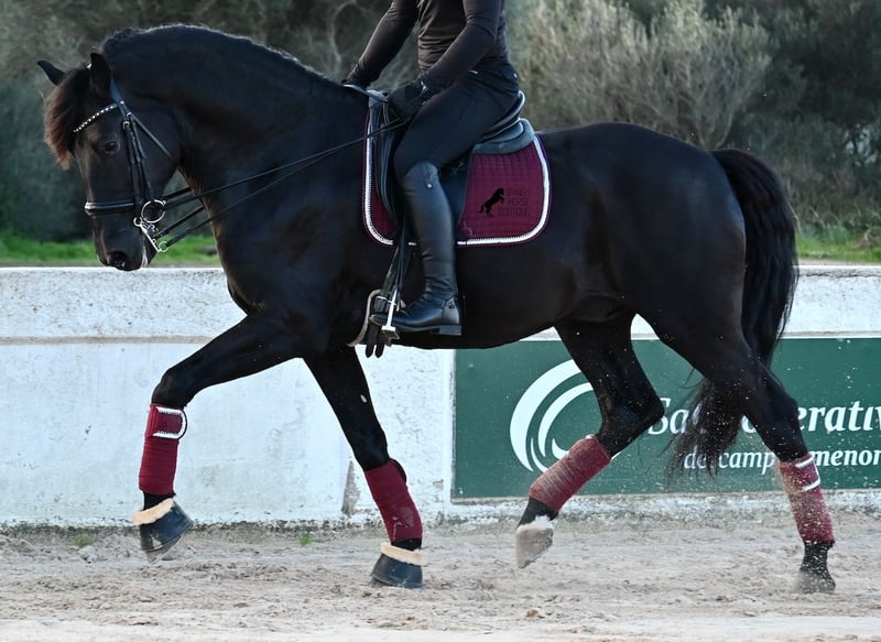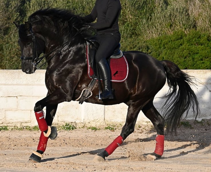 This purebred Menorquin stallion, born in 2017, once again demonstrated the calmness and coolness typical of a Menorquin during our photoshoot. Despite wind speeds of 70 km/h and gusts reaching 100 km/h, I was nearly brought to tears by the wind, making it difficult to see through the camera viewfinder, but he performed as if it were a beautiful day! When he stepped off the trailer, his blanket fluttered in the wind, yet he remained completely unfazed. Everything around him was crashing and plastic flapping, but he stayed focused. Despite the cold and the surroundings—he was transported to a different stable for better riding facilities for the videos—he was not "fresh" or hyperactive, but clearly happy to be working properly. His beautiful Baroque mane didn't withstand the storm, but it still showcases his flowing mane beautifully. Watching him work is truly a pleasure, and anyone lucky enough to ride him will feel like they're riding on cloud nine! He is almost a schoolmaster, offering a lot: lateral work in all gaits, pirouettes (started in canter), flying changes, extended canter, and counter-canter—all ridden without spurs. You can give him the reins even in canter, and he remains in rhythm, stretches nicely, and doesn’t even think about rushing uninvited. He has repeatedly proven his talent successfully in competitions and is not only premium-approved but has also been promoted from the regular stallion class to Recommended for breeding. He has offspring, but remains a well-behaved, sensible stallion without any nonsense. For those unable to keep a stallion, there is the option of castration on site! If you're looking for more variety than just riding, he's perfect—he also drives single in a carriage and has even pulled a wedding carriage for a couple! His pedigree is impressive, and his size is remarkable—standing at 174 cm (about 16.1 hh), he is currently the tallest Menorquin I have measured so far! He goes both in the field with a group and alone, and, typical of Menorquin horses, he handles terrain over rocks and stones with ease. Price reflects his quality! Location: Menorca. Videos and pedigree available upon request. I am happy to arrange an on-site pre-purchase exam, training, castration, transport, or even your travel arrangements if you wish to view him personally. Please see my website or contact me for details. Greetings from Spain!