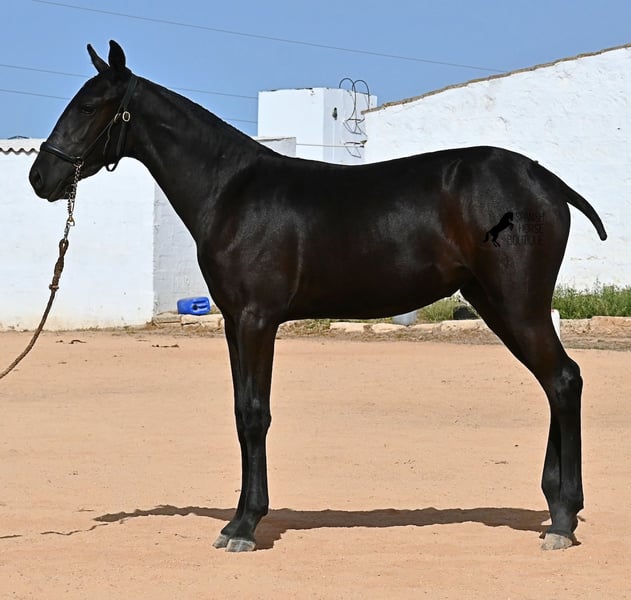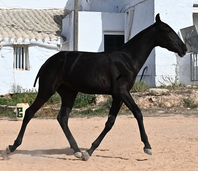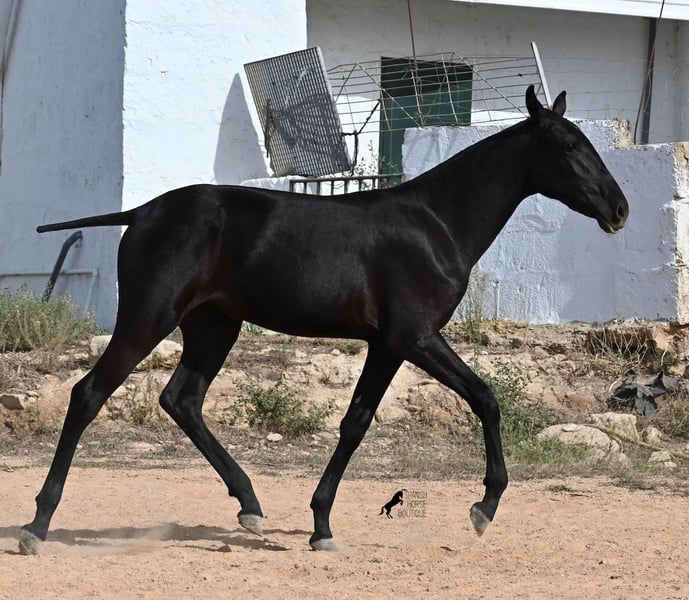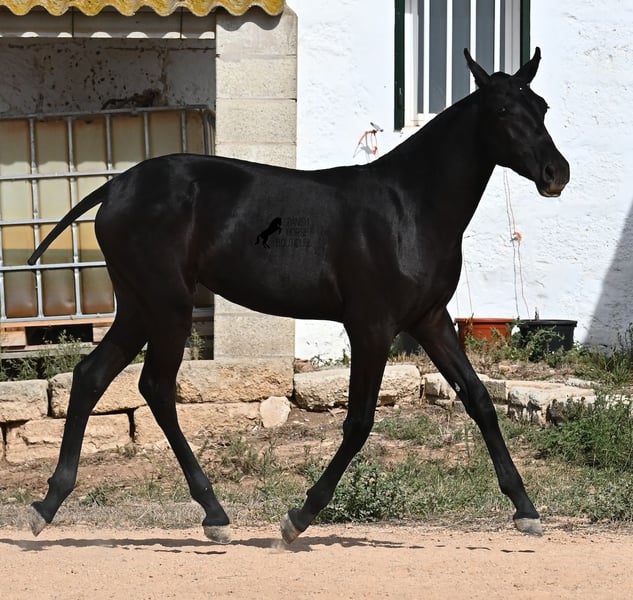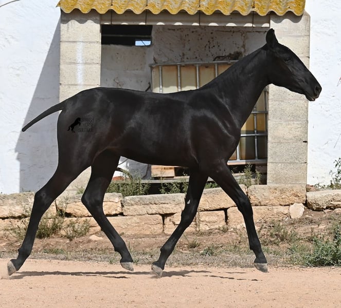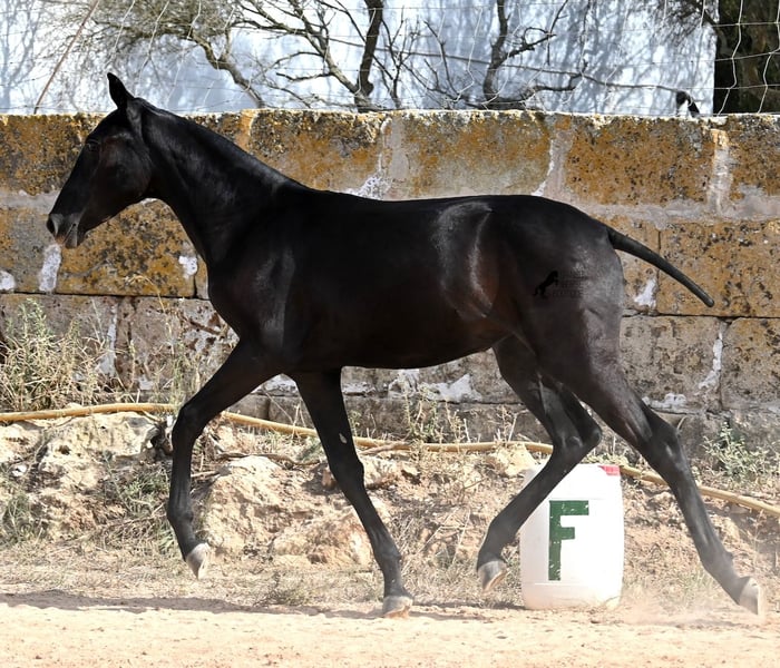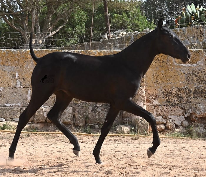 This purebred Menorquin filly, born in early 2025, has an impressive pedigree, as her father was the best stallion of the breed (best sire) and her grandfather is one of only 3 elite stallions of the breed. She has been successfully weaned and is halter-trained, having spent time in very large pastures with a herd of mares of all ages. The terrain is quite hilly, rocky, and very hard, where they are always outside in all weather conditions. This has not only made her very social and robust but has also contributed to her healthy growth, which is evident in her clean legs and good hooves. She now lives in a horse kindergarten, where she is allowed to play and thrive as desired during her upbringing to become a healthy and social horse. She has very correct movements and is very open towards humans. Her character is very calm and cool for a little one at such a tender age. Aside from a small white mark on her forehead, she is completely black, and her gaits are very correct, which will make her a versatile mare later on. Her expected final height will be around 162 cm. Videos and pedigree available upon request. Her location is Menorca. I would be happy to organize a foal vet check, transport, or even your trip if you wish to come and see her in person. Details can be found on my page or discussed in conversation. Greetings from Spain.