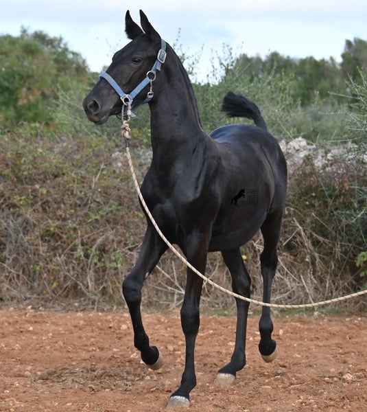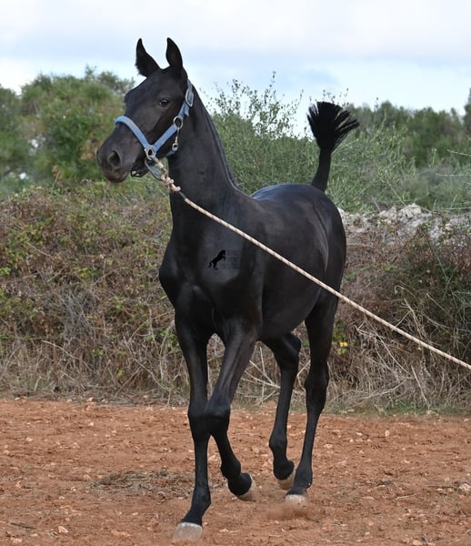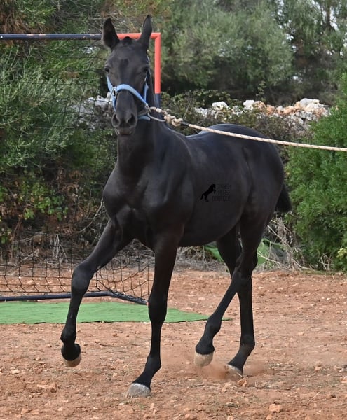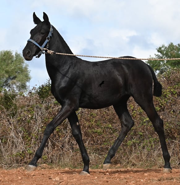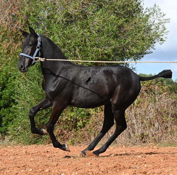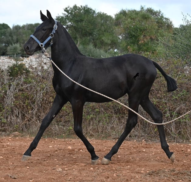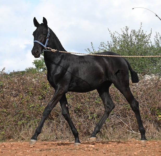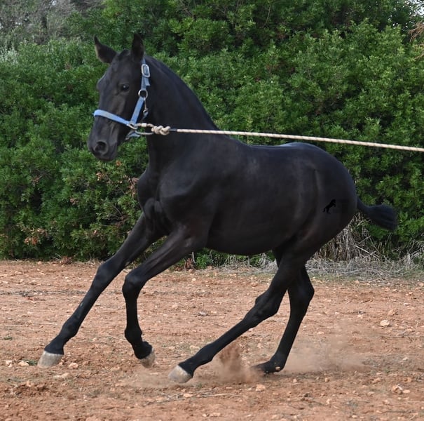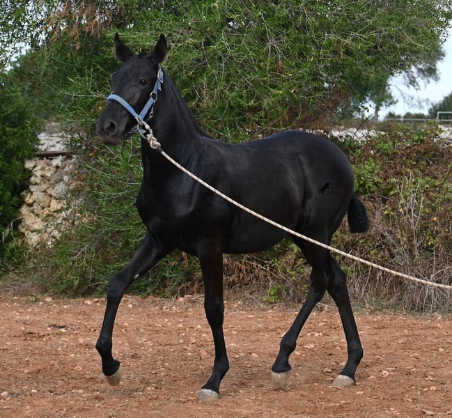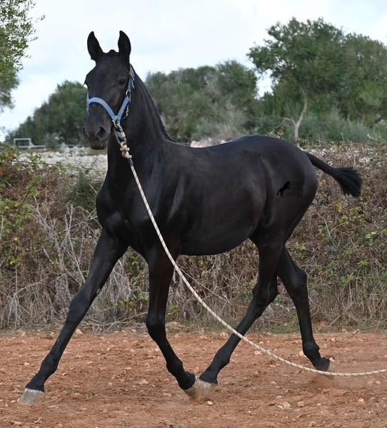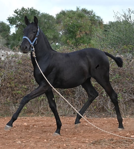 This purebred filly, born in spring 2025, is a truly elegant young lady! She comes from very old lines of the Menorquín, known for producing hardy horses, and she is beautifully jet black. With a blend of strength and grace, she demonstrates excellent movement, and proudly carries her tail high (traditionally docked like her mane). She moves gracefully even over rocky terrain, much like a ballet dancer. As is highly desirable in the breed, she has no white markings, and her dam is now even listed in the breed's improvement catalog. She is already quite tall, with her mother measuring over 16.1 hh. She was born in robust condition, is currently being weaned and is very calm and confident. She is familiar with dogs, children, and basic foal handling, and with her sweet temperament, she will learn quickly as she grows. Her expected final height is around 16.1 hh (or more!). Videos and pedigree available upon request. Her location is Menorca. I am happy to arrange a foal health check, transportation, or even her journey if you wish to visit her in person. Details can be discussed on my website or in a personal conversation. Greetings from Spain