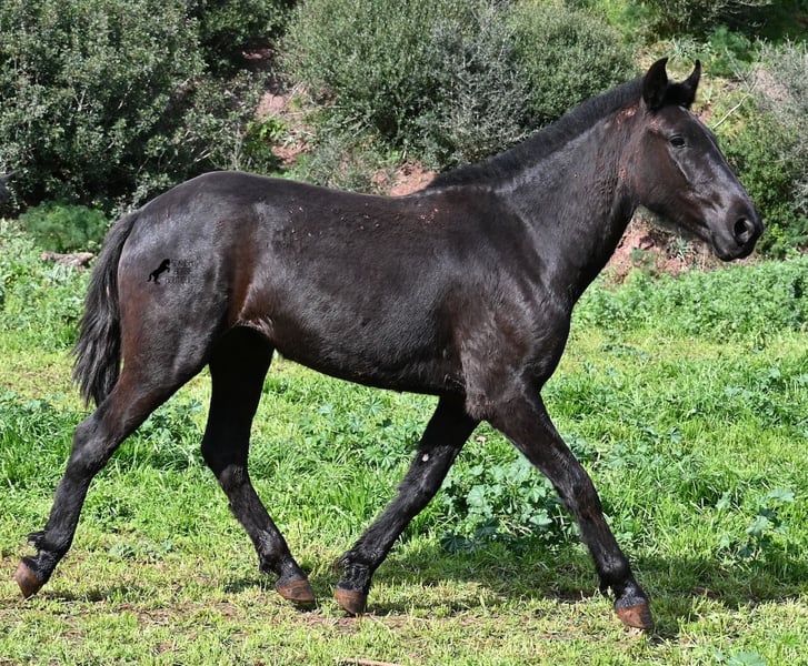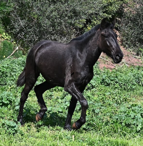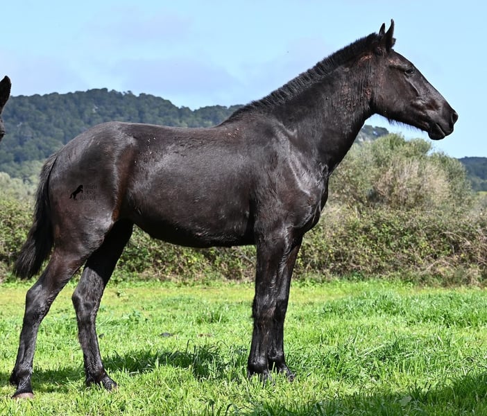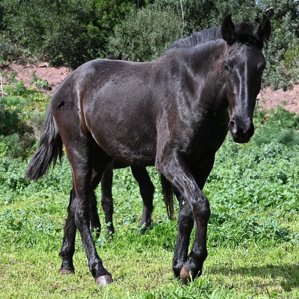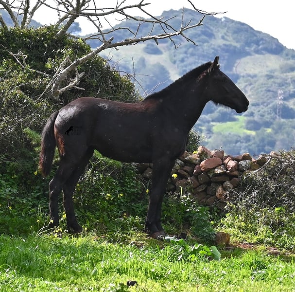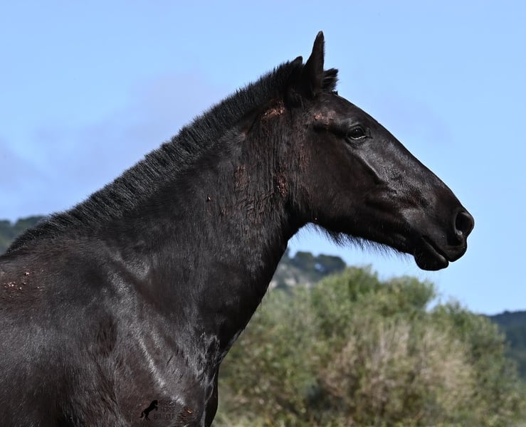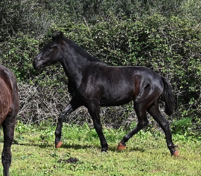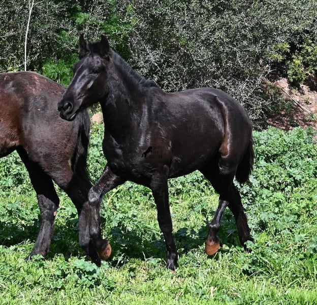 This 2023-born, purebred Menorquin mare is already very large for her age and will undoubtedly be a baroque beauty when fully grown! Her lineage is sensational, as she has both elite ancestry (there are only 3 elite stallions in the breed!) and a breed champion as a grandfather. The good breeding selection is evident in her already harmonious conformation and correct movement. She lives in a mare herd on many hectares of land, is well-socialized, and is also very robust due to the rustic upbringing. Whether it's slippery mud after the rain, like during the photo shoot, or rocky ground, she is absolutely sure-footed and moves skillfully over any terrain. Her expected height at the withers is around 163 cm, and she is interesting not only for riding sports but also for breeding! The price corresponds to her quality. Videos and pedigree available upon request. Her location is Menorca. I would be happy to organize a foal inspection, transport, or even your travel arrangements should you wish to come and see her in person. Details can be found on my page or in conversation. Greetings from Spain!