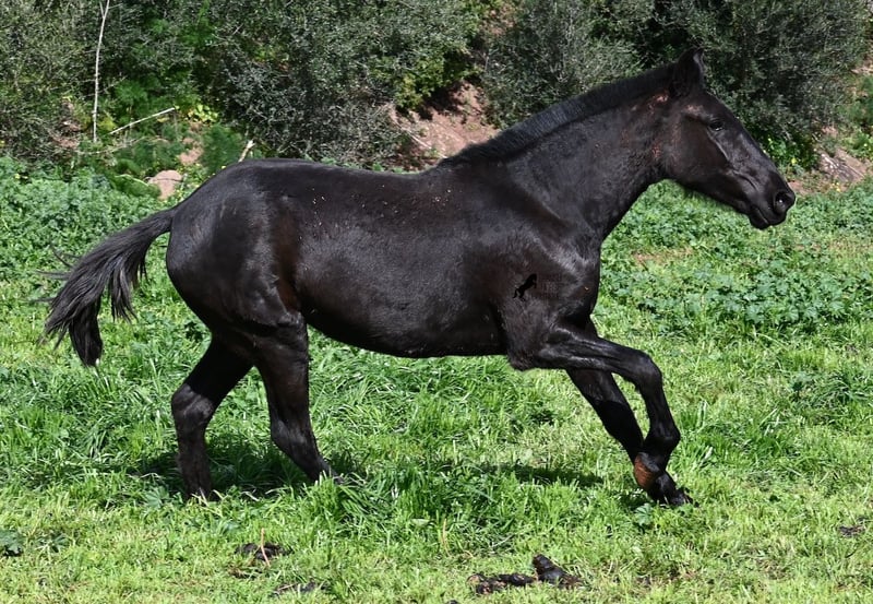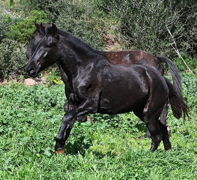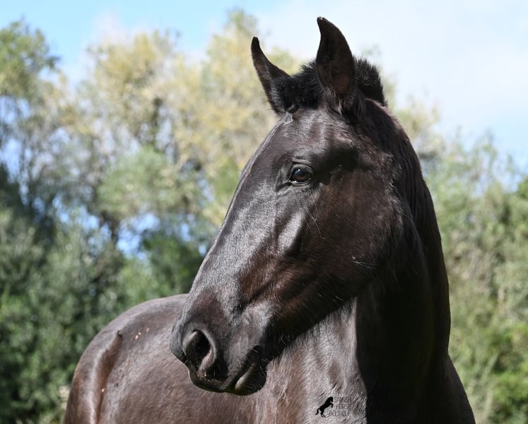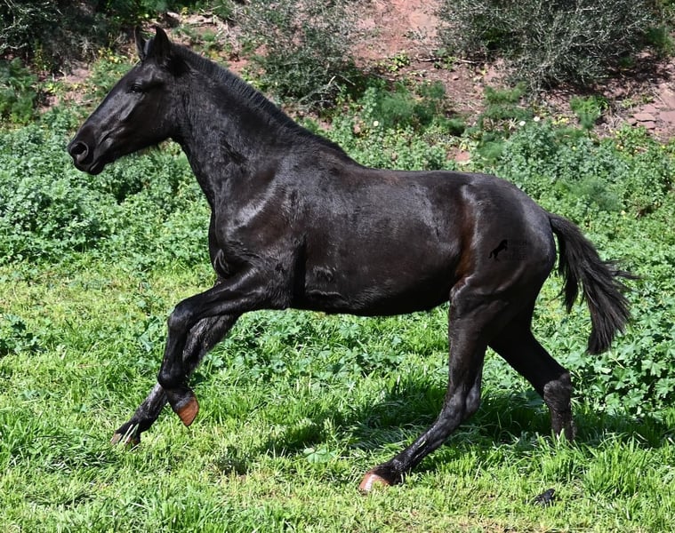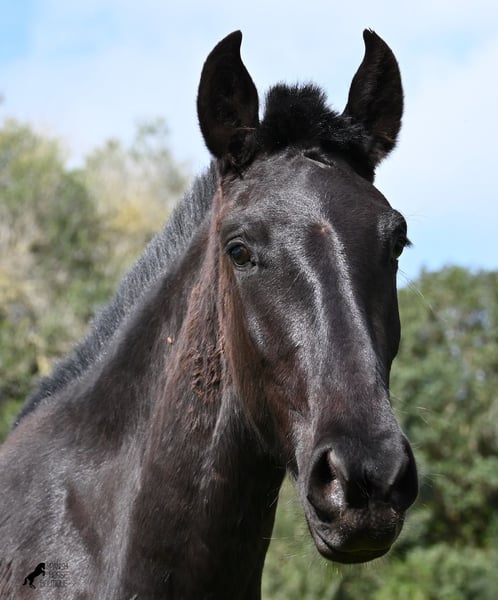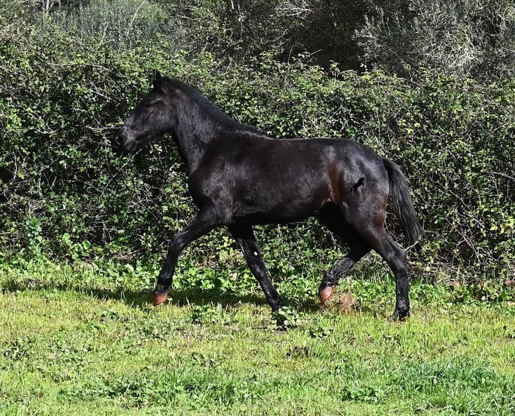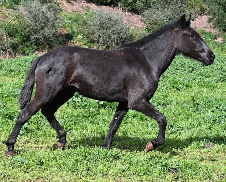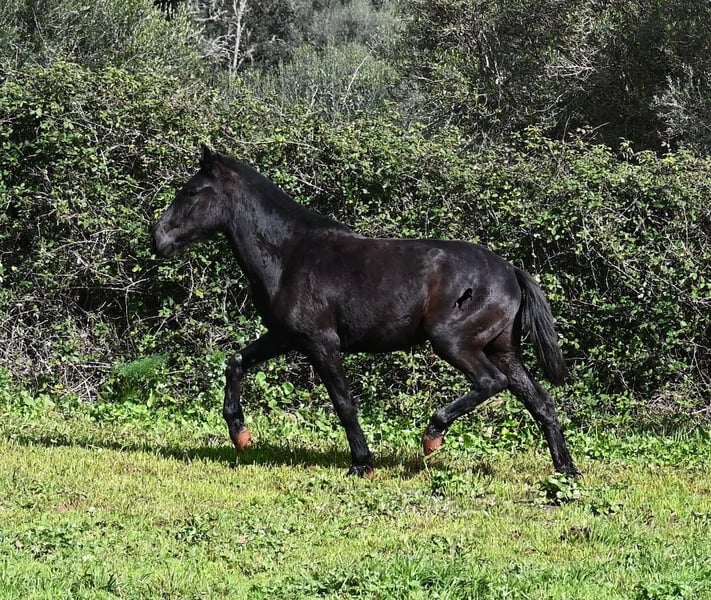 This 2023-born, purebred Menorquin mare is already very large for her age and will undoubtedly be a baroque beauty when fully grown! Her lineage is sensational, as she has both elite ancestry (there are only 3 elite stallions in the breed!) and a breed champion as a grandfather. The good breeding selection is evident in her already harmonious conformation and correct movement. She lives in a mare herd on many hectares of land, is well-socialized, and is also very robust due to the rustic upbringing. Whether it's slippery mud after the rain, like during the photo shoot, or rocky ground, she is absolutely sure-footed and moves skillfully over any terrain. Her expected height at the withers is around 163 cm, and she is interesting not only for riding sports but also for breeding! The price corresponds to her quality. Videos and pedigree available upon request. Her location is Menorca. I would be happy to organize a foal inspection, transport, or even your travel arrangements should you wish to come and see her in person. Details can be found on my page or in conversation. Greetings from Spain!