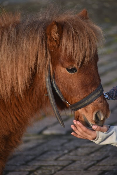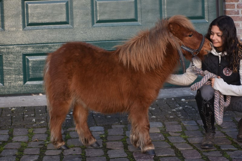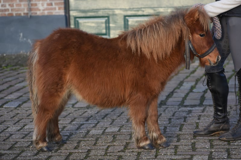 Ontmoet Takkie, een mooie, kerngezonde Shet van ruim een jaar oud en onder een meter hoog. Vanaf het eerste moment waren wij op slag verliefd, en dat is ook niet zo gek als je kijkt naar zijn lieve hoofdje en zijn sprankelende oogjes. Daarnaast is hij heel sociaal en kan hij echt goed lopen! Het is dan ook een kruising met een mini paard. Takkie is hier binnengekomen als hengst. Ook toen was hij hier al ontzettend braaf en nuchter in de omgang. Inmiddels is hij ruin Omdat hij nog jong is, ligt de hele toekomst nog voor hem open. Je kunt samen met hem groeien en in alle rust kijken waar zijn talenten liggen. Wordt hij jouw toekomstige menpony voor de kar? Of zie je hem straks schitteren onder het zadel? Hij loopt nu al netjes mee met de wandelingen langs de weg, terwijl het grootste verkeer voorbij raast. Wie gaat er met deze knapperd een leuke toekomst tegemoet? Prijs: 895,00