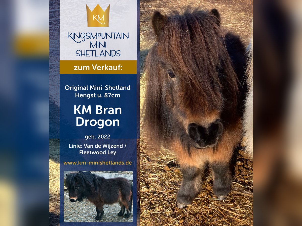A beautiful home-bred stallion from our family breeding. Can be haltered, can be handled by children, hoof trimming with Flex possible, roadworthy, knows dogs, cats and mice - everyday noises - never ill - no eczema, no laminitis - stands with us in a small mixed herd in an open stable. A stallion with beautiful thick hair - remains small - very interesting for breeding. More pictures and videos on request or at: www.km-minishetlands.de https://www.facebook.com/kmstallions.de/