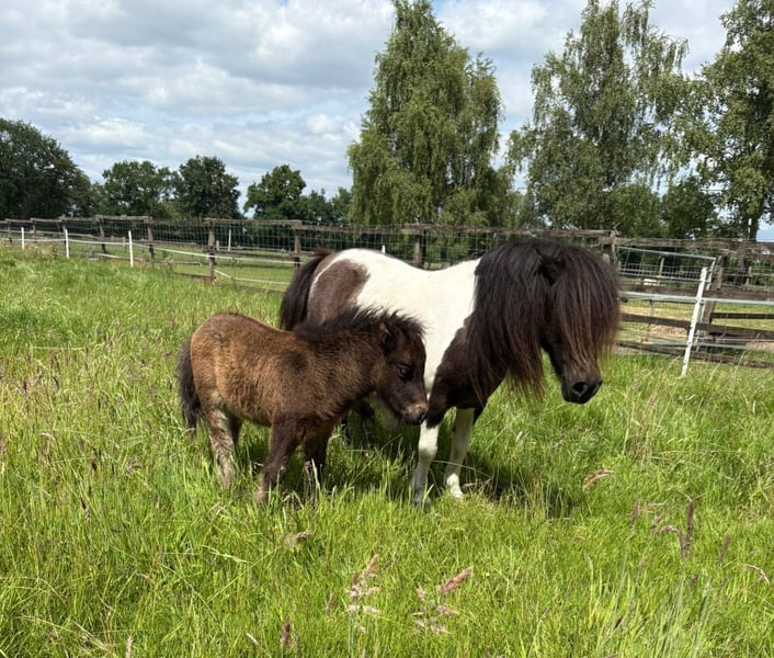 State Premium Mare, Original Mini Shetland, U87 cm We are offering our beautiful State Premium Mare for sale. She has had five foals with us, all of which were very correct and full of spirit. She is low in the hierarchy, completely insecure around fences, and avoids any conflicts. Not a children's pony, as she is overly cautious around humans. Her foals are easy to handle and approach. Health-wise, she has never had any issues with us. Her stunning mane and tail make her a real eye-catcher, and she passes this trait on. She also has an impressive trot that is sure to attract attention. Viewing possible at any time by appointment. Pedigree details can be provided upon request; however, inquiries without a name or asking for "best price" will be ignored.