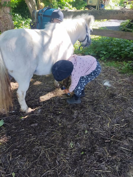 Polly is a small, typical pony, a theoretically white mare, approximately 17 years old, standing about 95 cm tall. I am only placing her in the best hands, where it simply fits. Ideally, I would like to rehome her together with Floh, as they get along very well. This is not an emergency sale! I am only offering her because my children have become too heavy for her, and she now mostly stands around unused. Polly is a classic pony that one must truly appreciate. Sometimes a bit sassy and moody, but she loves walks, and is comfortable lunging on a simple or double lunge line, knows long reins, a lunge line with a sleeve, and pulling a sleigh while being led. I originally wanted to start her under saddle, but despite planning to do so for the past four years, I haven't found the time and realistically don't think I will. However, I can very well imagine her being driven in a carriage. As a children's pony, she is fantastic! Easy to handle, groom, decorate, and ride while led. She is mostly relaxed (except around tractors). Please contact me for further details if interested.