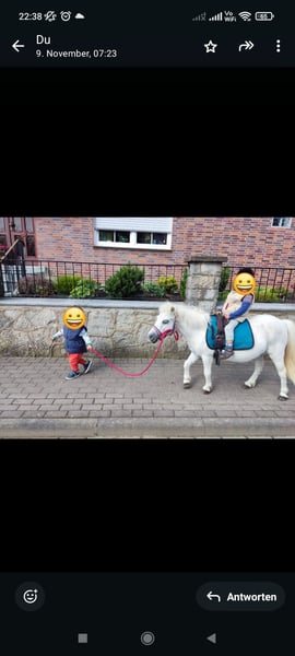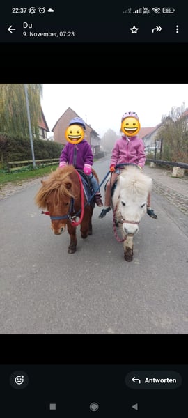 Polly ist eine kleine, typisch Pony, theoretisch weiße, ca. 17j. alte Ponystute mit einer Größe von ca. 95cm. Sie gebe ich nur in die besten Hände ab, da wo es einfach passt. Am liebsten würde ich sie nur zusammen mit Floh weggeben, da die beiden sich sehr gut verstehen.Es ist kein Notverkauf! Ich gebe sie nur ab, da meine Kinder zu schwer für sie geworden sind und sie jetzt doch überwiegend herumsteht. Polly ist ein typisches Pony, was man gerne haben muss. Manchmal etwas zickig und launisch, liebt aber Spaziergänge, geht an der einfachen longe sowie an der doppellonge, kennt langzügel, Schleppe und Schlitten ziehen, während sie dabei geführt wird. Eigentlich wollte ich sie einfahren, aber das wollte ich jetzt die ganzen 4 Jahre und habe es zeitlich nicht geschafft, sodass ich realistisch glaube dass ich es auch nicht mehr schaffen werde. Aber ich kann sie mir sehr gut vor der Kutsche vorstellen. Als Kinderpony ist sie super! Lässt sich führen, putzen bemalen und auch geführt reiten. Sie ist überwiegend entspannt (außer bei Trecker). Alles weitere bei Interesse.