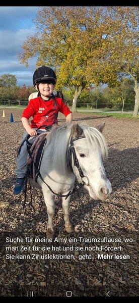 Due to lack of time, we are selling our adorable Amy. Amy is 6 years old and a approximately 78/80 cm tall tiger mare. Amy is pregnant, due in April 2026, by a miniature black stallion. She has been ridden (by my 15 kg son). She is clever and can perform various circus tricks; she pulls children on roller skates or sleds and comes along to the playground. She reliably accepts all four hooves, including when the farrier comes. She has no issues with trailer loading. She has never been ill so far! Amy has never been kept permanently in a pasture. No signs of rearing. She has been regularly dewormed and presented to the farrier. Unfortunately, I no longer have the time for her; she needs mental stimulation, learning, and her treats afterward. She’s not a pony that just wants to stand around.