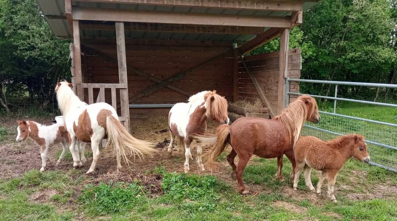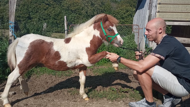 Full paper AMHA, genetic tests completed. Their sire was born in Canada (Countrylanes Magic Adonis, chestnut pinto, 32 inches): see the third photo. Foal: Pégase (chestnut pinto, dark blue eyes), born on April 5, 2025: stunning Arab-like appearance. €1,800 (discount possible if you also take his half-sister: Paloma Alezane). They have been raised with strict discipline to ensure they are safe, even around young children, and easy to handle. They approach on all four legs without any restraint, never kick, allow themselves to be touched everywhere without fear, and are led on a halter. They can only be adopted to live with at least one other horse; since July, they have already been working in zootherapy with young children and elderly people. No wheelchair, walker, or children's cuddles scare them. This hardy, lightweight breed requires very little maintenance.