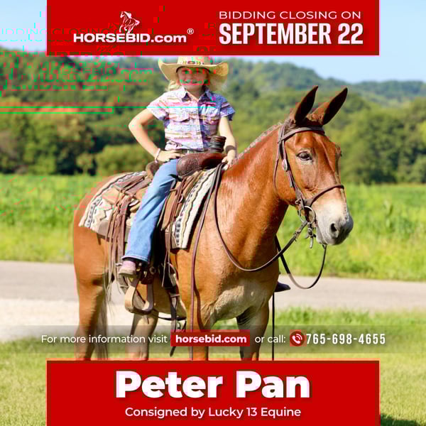 🍁𝒕𝒉𝒆 𝐅𝐀𝐋𝐋 𝑺𝒑𝒆𝒄𝒕𝒂𝒄𝒖𝒍𝒂𝒓🍁 Happening now thru MONDAY | SEPTEMBER 22nd - Available EXCLUSIVELY on HorseBid's website! For more details and to register visit: www.Horsebid.com CONSIGNOR CONTACT: Lucky 13 Equine 765-698-4655 LOCATION: Mount Vernon, Kentucky BREED: Mule REGISTERED: No REGISTERED NAME: Peter Pan COLOR: Sorrel HEIGHT: 14.3 AGE: 9 GENDER: John Mule 🌟Peter Pan is a 9-year-old, 14.2-hand John mule with all the looks, temperament, and training to stand out anywhere. He’s an experienced and versatile mount who is just as enjoyable on the trail as he is in the arena or at work. Easy to catch and eager for attention, Peter Pan has a quiet, people-oriented nature and a million dollar personality. He stands patiently for brushing, clipping, farrier work, and even having his ears handled, and he is calm and trustworthy around children, dogs, and even little critters. Peter Pan is 100% sound in every way. Under saddle, Peter Pan walks, trots, and canters smoothly in both directions, stops and backs willingly, and side-passes to open and close gates with ease. He works equally well alone or in company without becoming barn-sour or attached to other animals. This mule has been extensively trail-ridden, including overnight camping trips from here to Montana, and he handles new environments and varied terrain like a seasoned pro. Peter Pan has also been shown at local fun shows in multiple classes and used at exotic animal sales to push, pen, and sort a wide variety of animals from Brahamas to ostrich’s. This guy has spent many nights coon hunting, he tracks easily with dogs, stands good for gunfire, packs out game, and you can even pony your dogs back to the truck. Peter Pan is the type you can leave off and when you’re ready he’ll ride off just like you rode him yesterday. He is also not the typical John mule that’s going to aggravate anything he is turned out with. Whether you’re looking for a sure-footed trail partner, a handy ranch mule, or a safe, versatile mount for the family, Peter Pan combines training, temperament, and experience in one stout, eye-catching package. You do not have to have mule experience to get along with Peter Pan! Our boy is truly is NOT your typical mule and will be a blessing to any family.