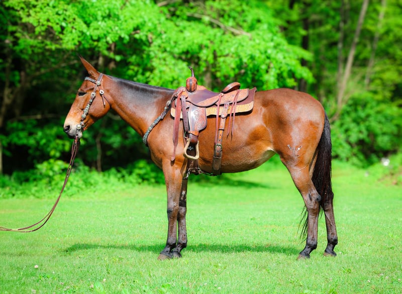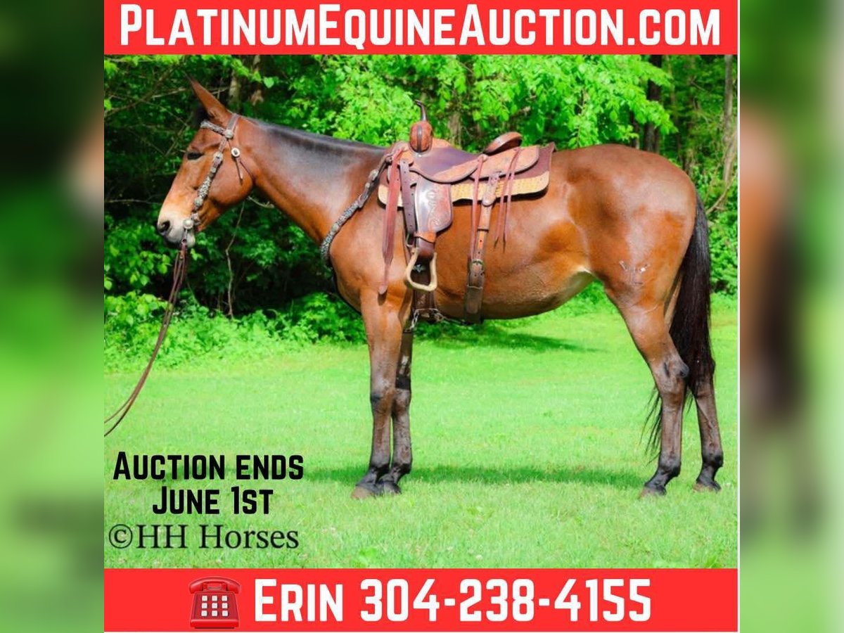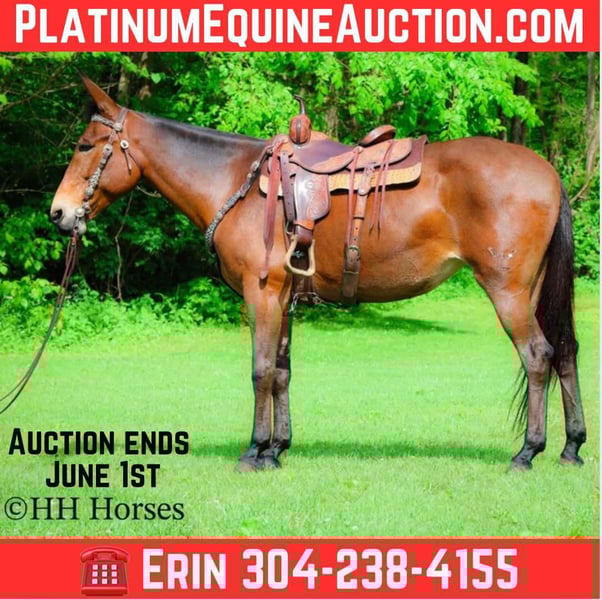 ONLINE AUCTION Place your bids at www.PlatinumEquineAuction.com Starting Bid $3500 Auction ends June 1st, 2025 Need a new saddle? Check out White Rock Saddles on our website or Facebook! This is “JADA”, one exceptionally well trained, seasoned, and experienced BAY MOLLY MULE that has been shown in reining, ranch pleasure, trail classes, and halter. This mule is extremely well broke, gentle, honest, and safe. She has been trail ridden all over the mountains by a lady in her late 60’s. She has been a one owner mule and been well taken care of. She has won many blue ribbons in many different classes. She has been ridden English and Western. This mule will sit down and turnaround, slide stop, side pass, ride around collected and correct, and stand to mount, tack, and groom. She has impeccable ground manners, loads, bathes, and hauls with no issues. She rides out alone, crosses water, handles rocky steep terrain, and will go anywhere you point her. She is traffic safe, not spooky, and so much fun to ride. She is 10 years old and stands 16.1 hands tall. If you want a mule that any level rider can get on and get along with, here she is. She will make a beginner look like a professional. She is quiet, safe, patient, kind, and honest. Contact HH Horses Erin 304-238-4155 with any questions, to make a Buy It Now Offer or to set up a time to come see her. ONLINE AUCTION Place your bids at www.PlatinumEquineAuction.com Starting Bid $3500 Auction ends June 1st, 2025 Need a new saddle? Check out White Rock Saddles on our website or Facebook!
