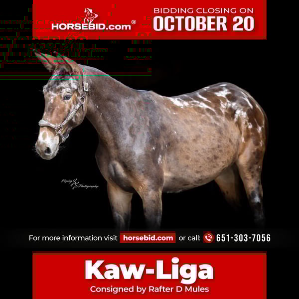 ♦️ 𝐭𝐡𝐞 𝐀𝐌𝐄𝐑𝐈𝐂𝐀𝐍 𝓕𝓪𝓵𝓵 𝓒𝓵𝓪𝓼𝓼𝓲𝓬 ♦️ Happening now thru MONDAY | OCTOBER 20th - Available EXCLUSIVELY on HorseBid's website! For more details and to register visit: www.Horsebid.com CONSIGNOR CONTACT: Rafter D Mules 651-303-7056 LOCATION: Hastings, MN BREED: Mule REGISTERED: No COLOR: Black Blanketed HEIGHT: 15.2 AGE: 2 GENDER: John Mule Kaw-Liga is a head turning mule who will get you noticed anywhere you take him. While his coloring is loud and unique; his disposition is our favorite! Kaw-Liga was imprinted at birth and has been handled frequently ever since. He is easy to catch and will come to you in a 100 acre field! Kaw-Liga is friendly to be around, and is ready to start your way. He has excellent ground manners, will let you pickup all four feet with ease, and will even let you rub all over those long ears. If you're looking for a mule that will be an absolute showstopper, look no further than Kaw-Liga. He will make someone a fancy riding mule! For any additional information, please contact Dillon at 651-303-7056.