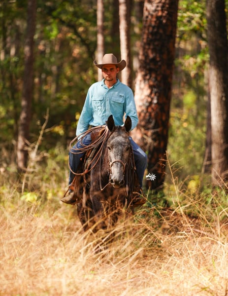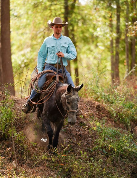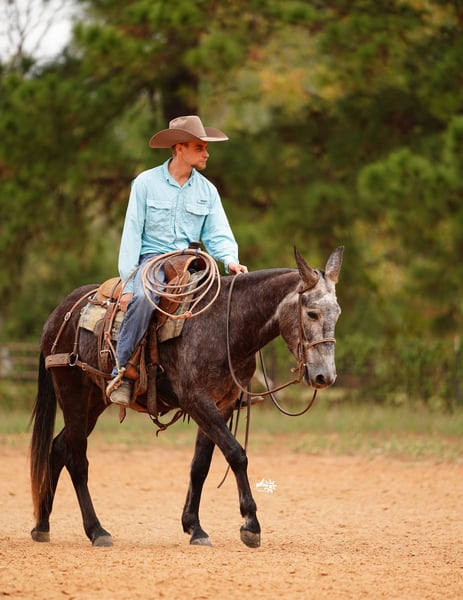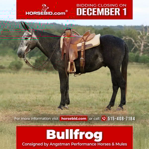 ⚜️ 𝓽𝓱𝓮 𝐇𝐨𝐫𝐬𝐞𝐦𝐚𝐧'𝐬 𝓢𝓱𝓸𝔀𝓬𝓪𝓼𝓮⚜️ Happening now thru MONDAY | DECEMBER 1st - Available EXCLUSIVELY on HorseBid's website! For more details and to register visit: www.Horsebid.com CONSIGNOR CONTACT: Angstman Performance Horses & Mules 515-408-7184 LOCATION: Huntsville, TX BREED: Mule REGISTERED: No COLOR: Blue grey HEIGHT: 14.2 AGE: 3 GENDER: John Mule Bullfrog is handsome 3 yr old John mule standing 14.2 hands. This charming young mule is out of a quarter horse mare and mammoth jack. He has a ground covering walk that’ll carry you anywhere you’d like to go!!! Bullfrog has been used outside on the ranch and knows what an honest days work is!!! We have roped and doctored cattle out in the pasture on him and started team roping on him in the arena. He has been trail rode out in the woods and led pack horses, drug logs, crossed creeks, he will lead the group or follow along. Whether it’s in the arena or out in the pasture Bullfrog will trot and lope nice circles on a loose rein. He will ride one handed, turn around like a horse, sidepass, open gates, and go all day long. On the ground Bullfrog is gentle to be around, he is good with his feet and ears. He does have to warm up to new people and is not yet for a beginner rider. He is a good young mule that has seen lots of miles already, with more time and maturity he will be a great mule to enjoy many years on!!!