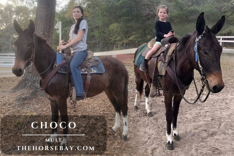 “Choco,” the mule! He is a very curious and sweet mule. First to meet you at the gate every time. Choco loves attention, but especially children. While Choco is young he is an experienced babysitter! With more whoa than go, this flashy gelding is an excellent trail riding companion! He gets along great with other animals, and he is always ready for an adventure! Sure-footed and smooth, Choco also lies down on command for his riders to mount up! This mule is a barn favorite and flashy to boot!