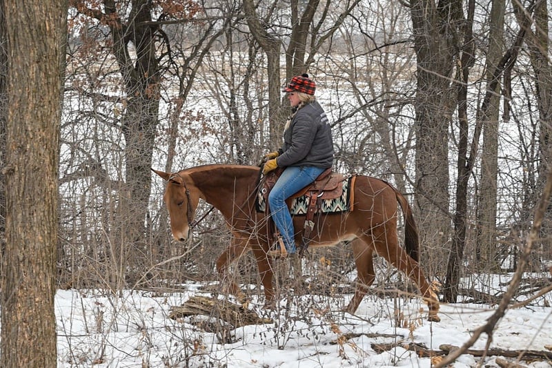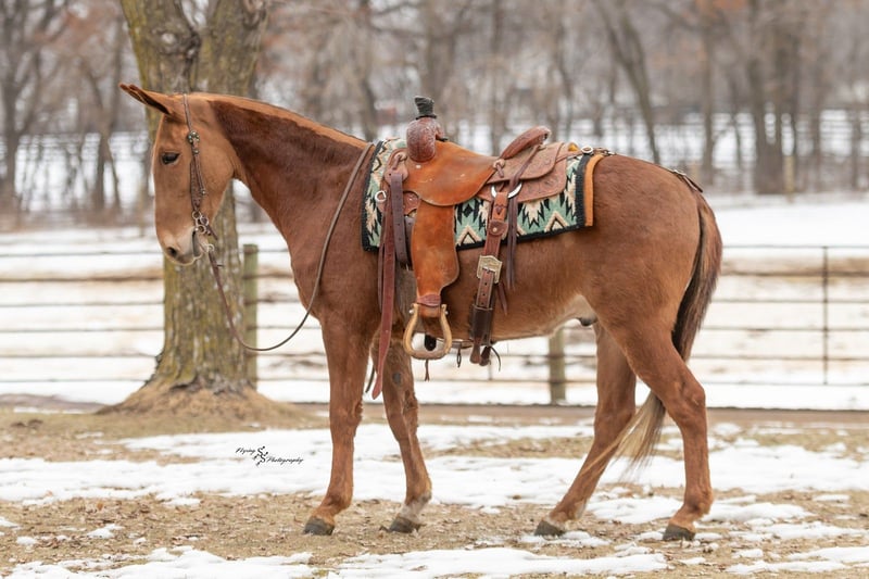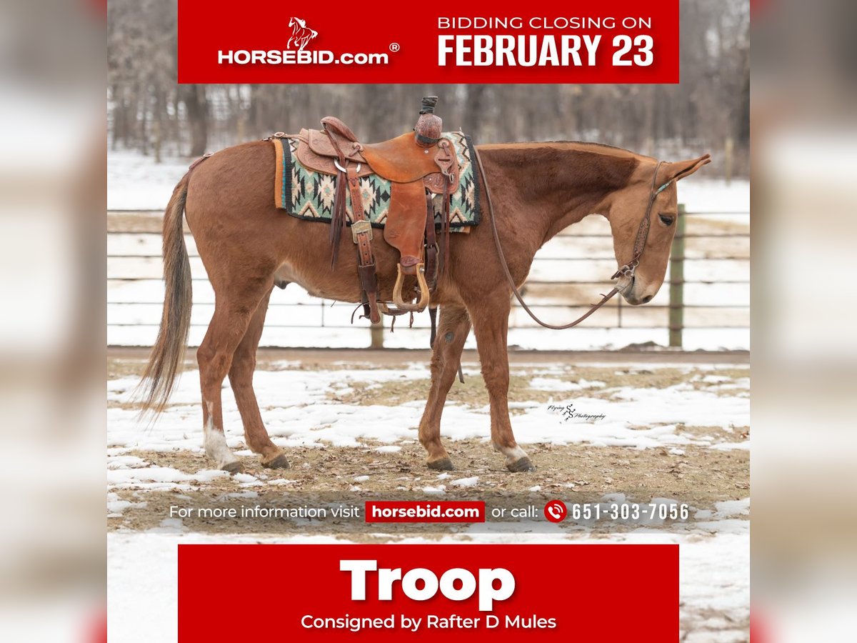 💎 𝐓𝐇𝐄 𝓓𝓲𝓪𝓶𝓸𝓷𝓭 𝐒𝐇𝐎𝐖𝐂𝐀𝐒𝐄 💎 Happening now thru MONDAY | FEBRUARY 23rd - Available EXCLUSIVELY on HorseBid's website! For more details and to register visit: www.Horsebid.com CONSIGNOR CONTACT: Rafter D Mules 651-303-7056 LOCATION: Hastings, MN BREED: Gaited Mule REGISTERED: No REGISTERED NAME: Troop COLOR: Sorrel HEIGHT: 14 AGE: 5 GENDER: John Mule Troop is a sweetheart of a mule who is very personable. He would make an excellent field trial or endurance mule and is already a wonderful trail mule. He has smooth gaits and covers ground. Troop crosses logs without hesitation, downed timber, or anything you might find out on the trails. He is very traffic safe, walks across ditches quietly, and crosses water. Troop stands at the mounted block to be mounted. He clips well, catches easily, picks up his feet, and stands quietly to be tacked up. Troop also lopes both directions, correctly picking up his leads. He will cross over the bridge and entertain many of the trail obstacles. Troop has a great foundation and is ready to be someone's favorite mount! He tolerates all of the commotion you can possibly throw at him. He is used to being pastured with other livestock and gets along well with everyone. He is also used to being around small pets. If you would like to meet Troop prior to the auction ending, or have any questions about him, please contact Dillon at 651-303-7056.