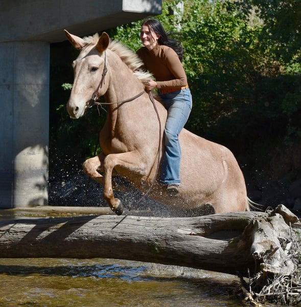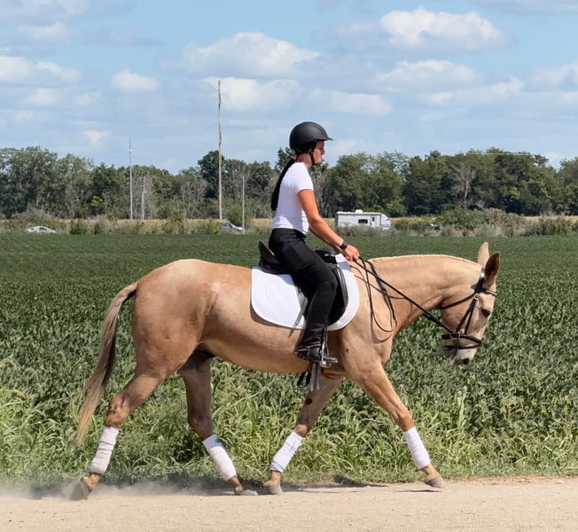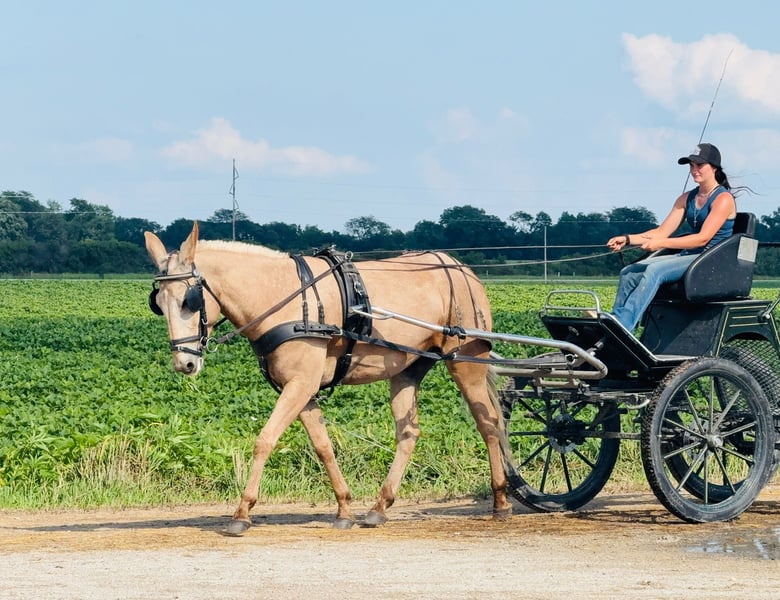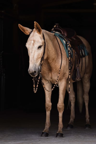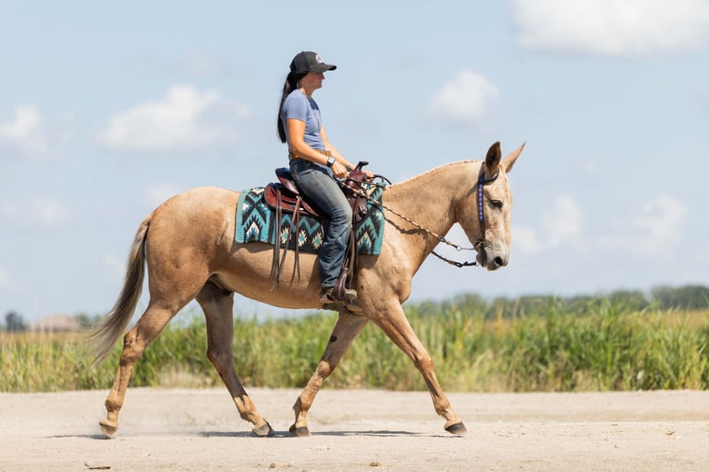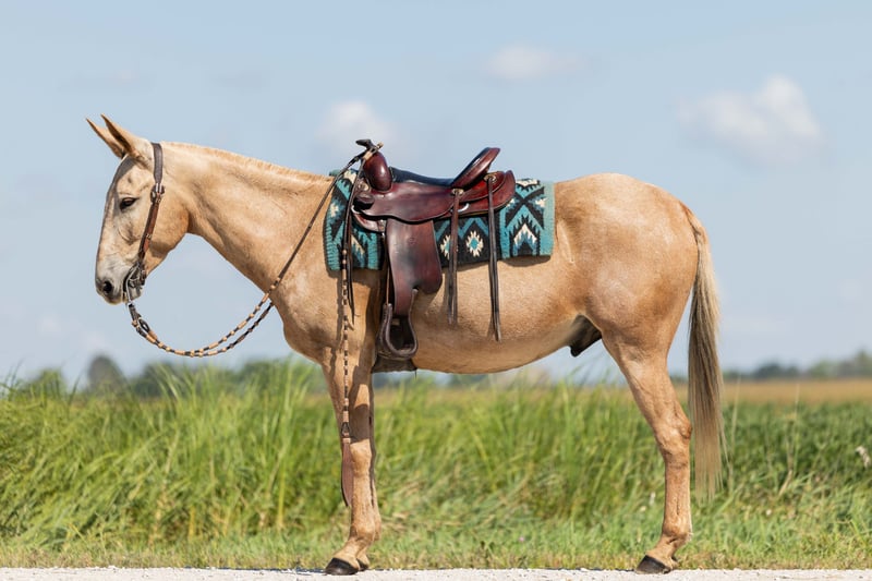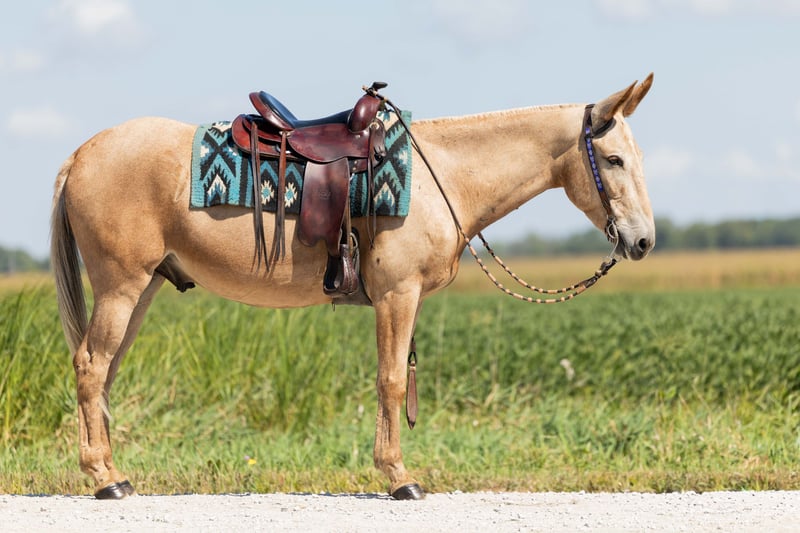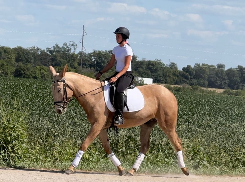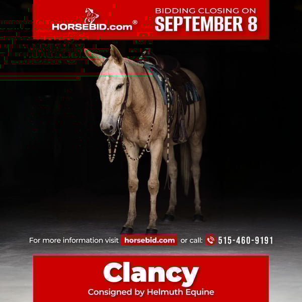 ♦️ 𝐭𝐡𝐞 𝐒𝐞𝐩𝐭𝐞𝐦𝐛𝐞𝐫 𝑺𝒆𝒍𝒆𝒄𝒕 ♦️ Happening now thru MONDAY | SEPTEMBER 8th - Available EXCLUSIVELY on HorseBid's website! For more details and to register visit: www.Horsebid.com CONSIGNOR CONTACT: Helmuth Equine (515) 460-9191 LOCATION: Ames, IA BREED: Mule REGISTERED: No COLOR: Palomino HEIGHT: 15.2 AGE: 5 GENDER: John Mule Meet Clancy, the most one of a kind mule you’ll ever find! He’s a 5-year-old, 15.2 hand mule with perfect conformation and not a blemish on him. Clancy has been with us for the past three years, and in that time, we’ve done just about everything you could imagine. Whether it’s a relaxing trail ride, jumping in the arena, or driving into town for ice cream, he takes it all in stride without a fuss. He has a wonderfully smooth trot or jog and will lope circles on a loose rein. Collect him up, ride him English style, and he’ll just as happily go to work that way too. Clancy is an excellent driving mule confident up and down the road, on trails, and anywhere else you want to take him. He’ll jump nearly anything you point him at without ever getting worked up. Even if he sits for months, you can catch him, tack him up, and ride off without an issue. Easy to load and haul, Clancy gets along well in a herd but is also perfectly content in a stall. He’s great for the farrier, stands quietly in the wash rack, and is a gentleman for tacking and untacking. Clancy is truly the complete package! A kind, versatile mule who will make someone the best lifelong partner you could ever ask for.