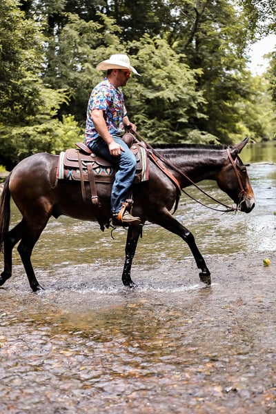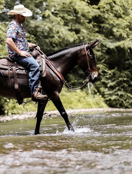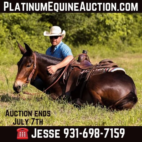 ONLINE AUCTION Place your bids at www.PlatinumEquineAuction.com Starting Bid $3500 Auction ends July 7th, 2024 Need a new saddle? Check out White Rock Saddles on our website or Facebook! If you are looking for one of the classiest and versatile mules around the look no further. Elvis is a 5yr old John mule standing right at 15hh tall. Elvis has been more places and seen more country in his short 5 years than most mules and people see in a life time. He is truly one hand broke, lays down on command, stands for the farrier and to be mounted and has the smoothest rocking chair lope. Elvis has been ridden in parade, trail ridden extensively, caught cattle in the arena and even hunted off of. He will side pass over to the gates to be opened, will go through the deepest creek, and climb the biggest hill. The best part about Elvis is he is safe for just about ANY LEVEL of rider. He will ride in the middle of a group or take lead and send the group through whatever you would like. Elvis is truly a one of a kind mule with his whole life ahead of him and the best part is HE IS GENTLE. For more info on Elvis call or txt Jesse Thomas 931-698-7159 Located in Santa Fe, TN. ONLINE AUCTION Place your bids at www.PlatinumEquineAuction.com Starting Bid $3500 Auction ends July 7th, 2024 Need a new saddle? Check out White Rock Saddles on our website or Facebook!