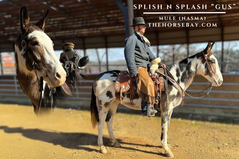 OPEN BIDDING ON THEHORSEBAY,COM. SALE ENDS ON 02/04. More information is available on the website, including an UTD vet inspection, Coggins, video, images, and the owner's contact information to ask questions, request information, or make arrangements to come to visit. Splish n splash (Gus). Gus is a 7year old John mule registered in the Saddle Mule Association. He has been through all my trainings and has become a really great mule. Gus is kid friendly. Loves attention. Easy to catch. We use Gus on any kind of ranch or farm work. Ponying colts, he neck reins, side passes, works off of rein pressure or leg pressure. We have hog hunted, coon hunted off him, can shoot the gun from his back Pop the bull whip He is a great one to go out and trail ride or just ride down the highway is traffic safe He has a really nice running walk and a really smooth rocking chair lope.. whether you want to go to the show ring or just a really nice trail riding mule Gus is your mule.