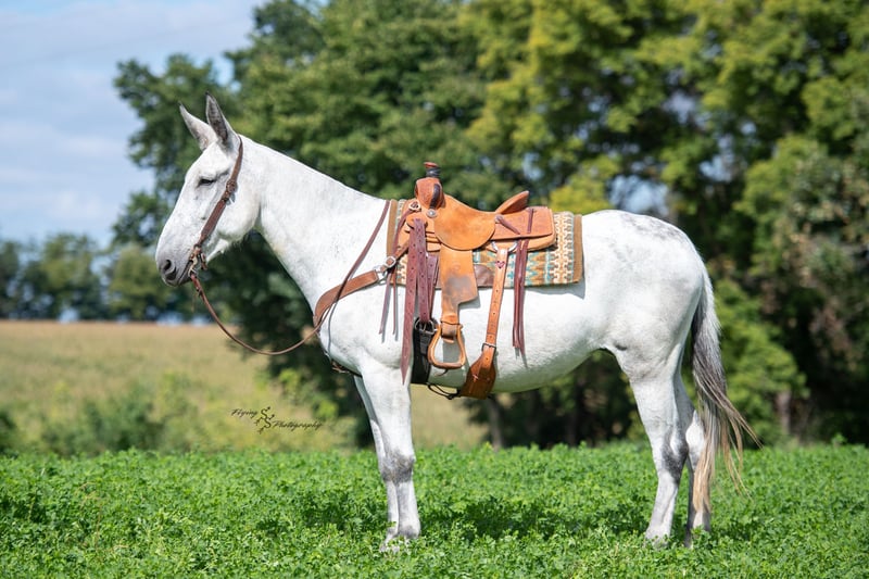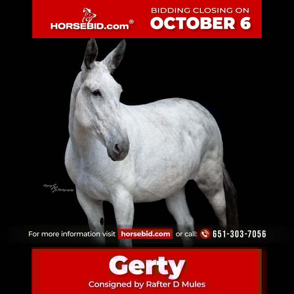 🍂 𝓐𝓾𝓽𝓾𝓶𝓷 𝑨𝑳𝑳 𝑺𝑻𝑨𝑹 𝑳𝑰𝑵𝑬𝑼𝑷 🍂 Happening now thru MONDAY | OCTOBER 6th - Available EXCLUSIVELY on HorseBid's website! For more details and to register visit: www.Horsebid.com CONSIGNOR CONTACT: Rafter D Mules 651-303-7056 LOCATION: Hastings, MN BREED: Gaited Mule REGISTERED: No COLOR: Gray HEIGHT: 16.2 AGE: 10 GENDER: Molly Mule Gertrude, or "Gerty" as we like to call her, is an elegant mule that will work for any ladies or gentlemen that love to trail ride. She is out of a Tennessee Walking mare who passed down a smooth gait, which makes taking her down the trails even more enjoyable. Gerty is a forward moving mule that does not have to be asked for every step. She does well at the front or middle of the trail group, and rides as well alone as she does with a group. Gerty has more miles on the trail than most trucks have that travel across the country. She is very experienced and takes the best care of anyone who swings a leg over her. Gerty is easy to catch whether she is with pasture mates or in a private paddock. She has no problem with her ears being touched, making her easy to halter and bridle. Gerty is easy to shoe and acts like a lady when having her feet handled. She is the type of mule than any trail rider will get along wonderfully with. Gerty stands patiently to be mounted from the mounting block or the ground. Out on the trail and can't get back in the saddle? No worries, because Gerty will stand by a log or anything needed for you to get in the saddle. She would also work well for anyone looking for an honest mount to ride at field trials. Gerty is the real deal and will make someone very happy to add her to their family. The only mistake you can make with this sweet lady is not placing the winning bid! If you have any questions or would like to meet Gerty prior to the auction ending, please give Dillon a call at 651-303-7056.