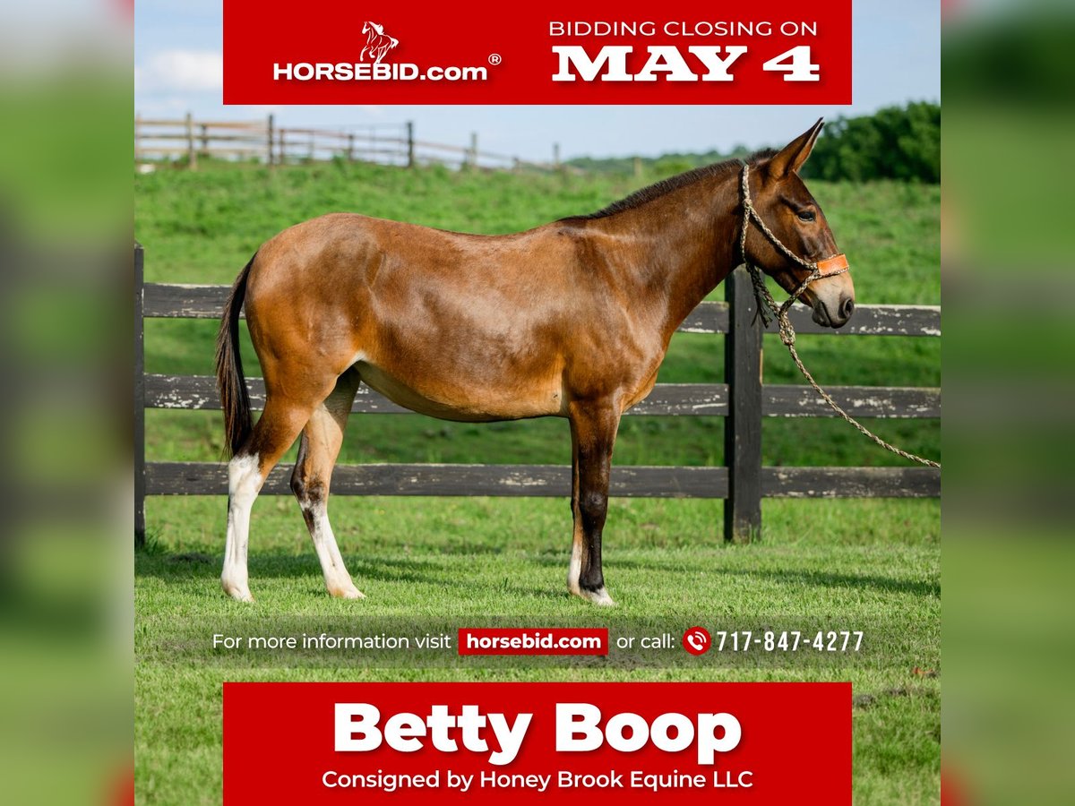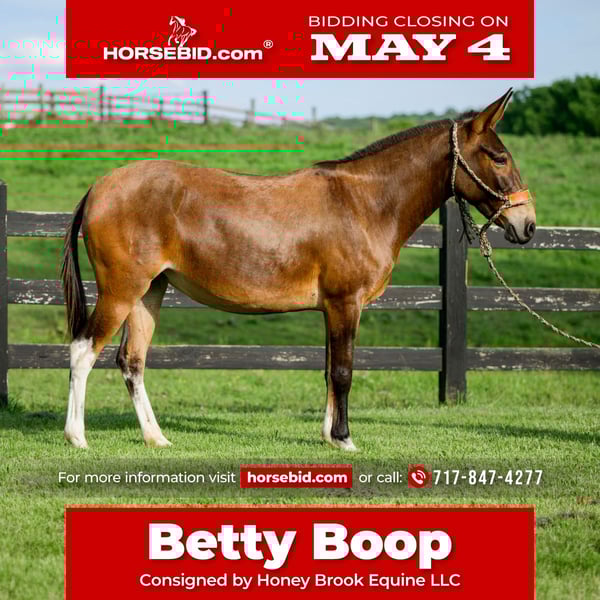▪️▫️◾️𝐭𝐡𝐞 𝑴𝒂𝒚 𝐒𝐞𝐥𝐞𝐜𝐭◾️▫️▪️ Happening now thru MONDAY | MAY 4th - Available EXCLUSIVELY on HorseBid's website! For more details and to register visit: www.Horsebid.com CONSIGNOR CONTACT: Honey Brook Equine LLC 717-847-4277 LOCATION: Honey Brook, PA BREED: Mule REGISTERED: No COLOR: Bay HEIGHT: 13.2 AGE: 8 GENDER: Molly Mule Wow, take a look at Betty Boop,a good lookin well trained Molly mule Betty Boop is one of the best trained mules you'll find that's for sale ,she has 3 smooth gaits you'll never get tired of ,a walk that is comfortable on the trail all day,a trot you can easily sit for hours, and a lope that anyone can ride. Betty Boop will move off of leg pressure easily ,she will side pass, move front quarters and hind quarters separately if needed and also she is sensitive off of your seat and energy and she can be ridden without a bridle and her responsiveness and speed won't change,she is more than happy to work in the ring if that's your thing. Betty Boop also is a willing mule,if you like doing obstacles, whether it's a scary tarp or teeter totter it doesn't faze her,she is good with carrying flags and tarps for you , and also she will stand while you throw your rope and drag your catch without a problem. On the trail Betty Boop will take you through any creek or bridge you meet or over any mountain you need to climb,she is a super good trail mount and has lots of miles under her belt and also she is a proven pack mule and goes well in a string ,she is a real workhorse and loves to have a job Also Betty Boop will lay down on cue which makes it easy to mount and dismount, be sure to watch the video,she is 100 percent sound, contact us for more information and also we can help arrange shipping anywhere in the US