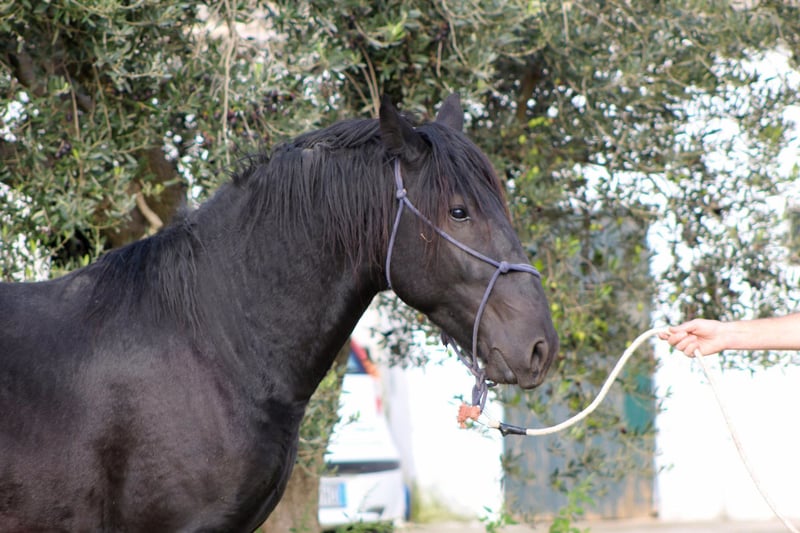 T.F. Proust Tequila An outgoing, very gentle on the hand, and affectionately cheeky – these words best describe Tequila. In the round pen, Tequila pays close attention to his handler and responds to the slightest changes in body language. He is very affectionate towards people, always ready for a little joke ;-). Tequila grew up with some buddies in the herd of the breeder from whom we are now able to offer him. He is familiar with life on a masseria, which means: dogs, guard geese, cows, tractors, and more dogs. He has professionally learned the basics of young horse training and is now looking forward to the next steps in his education with you. Currently, Tequila is not yet castrated but can be done upon request (included in the price) by the breeder. Born in 2023, his estimated final height is around 16.1 hh. If you would like to know more about Tequila – we look forward to your message. X-rays are available and, upon serious interest, can of course be viewed. We will also organize everything else for you – clinical pre-purchase examination, handling of the sales contract, transportation to your home stable, and more. Cavallo Murgese.de – on behalf of and in cooperation with the Italian Murgese Association A.N.A.M.F.