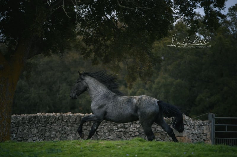 Tango di Farinella è un giovane stallone Murgese di straordinaria qualità, approvato alla riproduzione con la massima valutazione: classe A. Un primato che lo rende unico: è il solo figlio roano di Paisiello ad aver ottenuto questa distinzione, confermando la sua eccezionalità sia fenotipica che morfologica. Con i suoi 165 cm al garrese (destinati a crescere ulteriormente) Tango si presenta come un soggetto molto slanciato, armonioso e dai movimenti brillanti. Il suo carattere è fondamentalmente buono, ma Tango è un cavallo con una forte personalità: vivace, curioso e pieno di energia, richiede esperienza nella gestione di uno stallone. Un'opportunità rara per chi cerca un soggetto di sangue e valore.