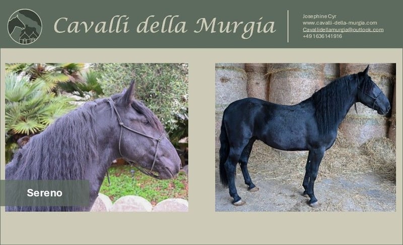 Sereno ist ein 2022 geborener Murgesenhengst, welcher sich momentan in Apulien, Italien befindet. Er hat einen tollen Charakter und ist dem Menschen liebevoll zugewandt. Zudem ist er stets aufmerksam und verfügt über ein sehr angenehmes Temperament. Sereno ist ein Murgese im Barocken Typ mit einer sehr hohen Versammlungsfähigkeit und einer sehr schönen Galoppade. Sein toller Charakter und seine guten Gangarten sorgen dafür, dass Sereno in Zukunft vielseitig einsetzbar ist und seinem neuen Besitzer sicherlich viel Freude bereiten wird. Sereno wird von Cavalli della Murgia vermittelt. Aus diesem Grund steht er zurzeit bei seinem Züchter in Italien, wo er bei Interesse gerne besichtigt werden kann. Bei weiteren Fragen stehen wir Ihnen gerne zu Verfügung. Sereno hat ihr Interesse geweckt? - gerne helfen wir Ihnen dabei einen Besuch in Italien zu organisieren. Ebenfalls helfen wir Ihnen gerne bei - der Abwicklung des Kaufvertrags, dem Transport nach Deutschland, sowie einer AKU Röntgenbilder liegen vor und können auf Wunsch gerne eingesehen werden. Weitere Bilder und Videos sind auf Anfrage möglich. Bei weiteren Fragen, melden Sie sich gerne bei cavallidellamurgia@outlook.com