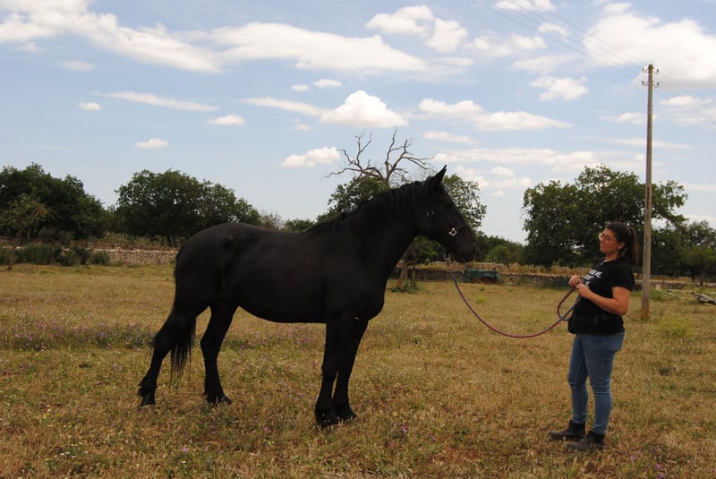 Today we are introducing Quera di Capoiazzo. Quera was born in our herd on May 2, 2020, so she will be 5 years old this spring. Quera grew up in our herd of Murgese broodmares, confronting horses of all ages during these almost 5 years. This has made her extremely relationally competent; she is a calm mare with other horses, is not aggressive and can relate to both older and younger subjects safely. In addition, she is not anxious, either relative to resources or at the time of removing her from the herd. She has had only positive experiences with humans, is able to box, and we are working through positive reinforcement, on her skills related to grooming, foot care and longe work. In October 2024, she was evaluated and approved as a broodmare with a very good score. Quera really represents an excellent opportunity for those who are looking for a horse that is healthy, and ready to start working on her saddle taming, without running the risk of doing premature work that could ruin her physique. She will be 5 years old shortly, and has not undergone any taming or early work that could compromise her. She is a very typical mare, even in her temperament. While she is sociable, she is one of those horses that bonds very closely to a few people in particular, giving them her whole self. Quera is excellent for those who want a companion for life with whom to work in classical riding, work riding and enjoy walking and trekking. Quera is a mare who does not spook easily, who reflects and reasons. We are looking for a permanent family for her that can take her in and make a lifelong journey. We are available to help you in the buying process: - by sending you all the photos, videos and documents you need for a long-distance purchase, - welcoming you if you wish to come to our kennel to meet her in person, - supporting you to arrange veterinary visits according to your wishes, - arranging transportation and its related documentation. You can visit our website: https://masseriacapoiazzo.it/ and our socials: instagram: https://urly.it/3ajhc Facebook: https://urly.it/3ajhd and contact Paola on whatsapp at: +393465232016 for any information, request, doubt or curiosity. -->Ours is a historical breeding, our Murgese horses live on the murgia 24/7. We have selected our broodmares so that we have more and more confident horses and we spend time in the herd every day, both to check their health and to create strong relationships with the foals and make them experience the man as a friendly presence. We apply scientific theories related to fear- and constraint-free learning modes to their grooming.
