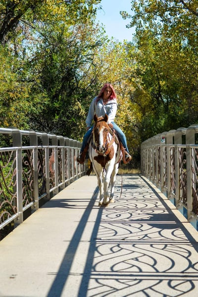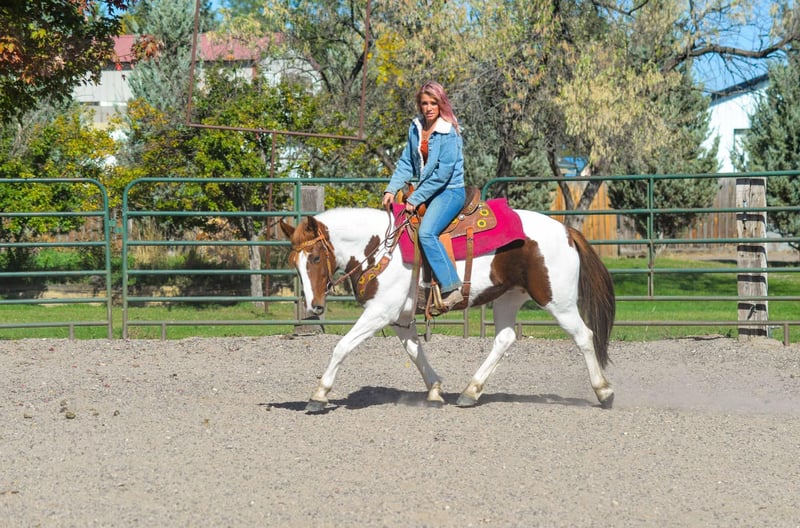 ONLINE AUCTION Place your bids at www.PlatinumEquineAuction.com Starting Bid $3500 Auction ends December 8th, 2024 Need a new saddle? Check out White Rock Saddles on our website or Facebook! Haven is a 10 year old (extremely eye catching) mustang paint mare! This mare is intelligent, athletic and EXTREMELY smart. This mare LOVES her job, she could work all day and still be having fun at the end of the day! She has been used for packing up into the mountains, hauling meat out and even seeing wild horses! She is great with steep terrain, knows how to use her hind end and if you drop your reins she’ll pick her way through rough territory! She has been in town as well, crossing bridges, around traffic (even with little kids on her) and around strollers,bikes and even a drive thru! She is fun! She has all the go and endurance you could ask for while being trustworthy, with a good brain. Haven has incredible feet and has been barefoot her whole life! We have carried flags on her, thrown tarps over and under her and messed around with trail obstacles, she is not hesitant to play with anything. Haven has a great collection and frame up, a smooth stop and rollback, flying lead changes, cross overs and is working on a finished neck rein. She is as handy in the arena as out with all of her desensitization, haven can still be untrusting on the ground. She loves having one owner and really needs a person that will spend time and bond with her Haven has been around the barrel pattern , is learning the poles and has even been roped off of making her a great all around mare for someone wanting to go any direction. This is a super fun mare (not to mention stunning) with a huge personality and a ton of brains. Don’t miss out!! Located in Fort Collins, CO. Contact Dynamite Horses Thea 970-632-3644 with any questions. ONLINE AUCTION Place your bids at www.PlatinumEquineAuction.com Starting Bid $3500 Auction ends December 8th, 2024 Need a new saddle? Check out White Rock Saddles on our website or Facebook!